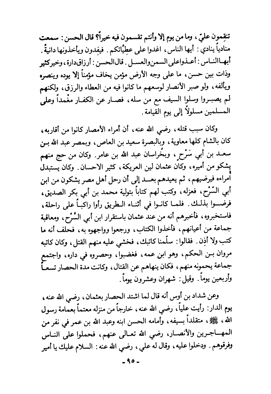وعن شداد بن أوس أنه قال لما اشتد الحصار بعثمان، -رضي الله عنه-، يوم الدار: رأيت عليًا، -رضي الله عنه-، خارجًا من منزله معتمًا بعمامة رسول الله، -صلى الله عليه وسلم-، متقلدًا بسيفه، وأمامه الحسن ابنه وعبد الله بن عمر في نفر من المهاجرين والأنصار، رضي الله تعالى عنهم، فحملوا على الناس وفرقوهم. ودخلوا عليه، وقال له علي، -رضي الله عنه-: السلام عليك يا أمير
