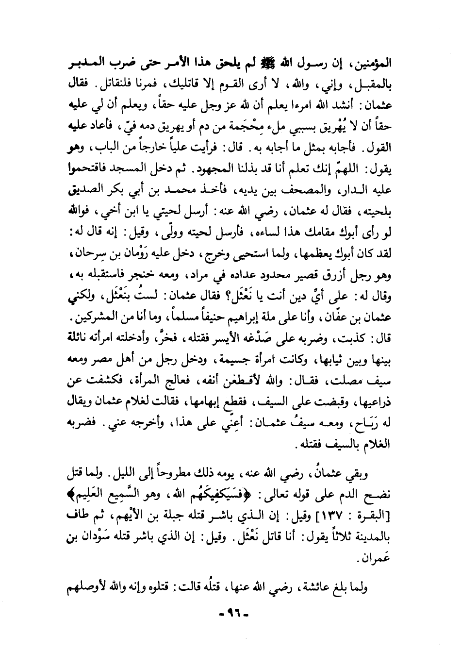المؤمنين، إن رسول الله -صلى الله عليه وسلم- لم يلحق هذا الأمر حتى ضرب المدبر بالمقبل، وإني، والله، لا أرى القوم إلا قاتليك، فمرنا فلنقاتل. فقال عثمان: أنشد الله امرءا يعلم أن لله عَزَّ وَجَلَّ عليه حقًا، ويعلم أن لي عليه حقًا أن لا يُهْريق بسببي ملء مِحْجَمة من دم أو يهريق دمه فيّ، فأعاد عليه القول. فأجابه بمثل ما أجابه به. قال: فرأيت عليًا خارجًا من الباب، وهو يقول: اللهمّ إنك تعلم أنا قد بذلنا المجهود. ثم دخل المسجد فاقتحموا عليه الدار، والمصحف بين يديه، فأخذ محمد بن أبي بكر الصديق بلحيته، فقال له عثمان، -رضي الله عنه-: أرسل لحيتي يا ابن أخي، فوالله لو رأى أبوك مقامك هذا لساءه، فأرسل لحيته وولّى، وقيل: إنه قال له: لقد كان أبوك يعظمها، ولما استحيى وخرج، دخل عليه رَوْمان بن سِرحان، وهو رجل أزرق قصير محدود عداده في مراد، ومعه خنجر فاستقبله به، وقال له: على أيِّ دين أنت يا نَعْثَل؟ فقال عثمان: لستُ بنَعْثَل، ولكني عثمان بن عفّان، وأنا على ملة إبراهيم حنيفًا مسلمًا، وما أنا من المشركين. قال: كذبت، وضربه على صَدْغه الأيسر فقتله، فخرَّ، وأدخلته امرأته نائلة بينها وبين ثيابها، وكانت امرأة جسيمة، ودخل رجل من أهل مصر ومعه سيف مصلت، فقال: والله لأقطعن أنفه، فعالج المرأة، فكشفت عن ذراعيها، وقبضت على السيف، فقطع إبهامها، فقالت لغلام عثمان ويقال له رَبَاح، ومعه سيفُ عثمان: أعِنّي على هذا، وأخرجه عني. فضربه الغلام بالسيف فقتله.