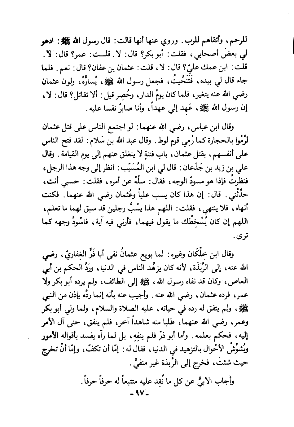 وقال ابن خِلِّكَان وغيره: لما بويع عثمانُ نفى أبا ذَرٍّ الغِفاريّ، رضي الله عنه، إلى الرَّبَذَة، لأنه كان يزهِّد الناس في الدنيا، ورَدَّ الحكم بن أبي العاص، وكان قد نفاه رسول الله، -صلى الله عليه وسلم- إلى الطائف، ولم يرده أبو بكر ولا عمر، فرده عثمان، -رضي الله عنه-. وأجيب عنه بأنه إنما ردَّه بإذن من النبي -صلى الله عليه وسلم-، ولم يتفق له رده في حياته، عليه الصلاة والسلام، ولما ولي أبو بكر وعمر، رضي الله عنهما، طلبا منه شاهدًا آخر، فلم يتفق، حتى آل الأمر إليه، فحكم بعلمه. وأما أبو ذرّ فلم ينفِهِ، بل لما رآه يفسد بأقواله الأمور ويُشوِّشُ الأحْوال بالتزهيد في الدنيا، فقال له: إمّا أن تكفّ، وإمّا أنْ تخرج حيث شئتَ، فخرج إلى الرَّبذة غير منفيٍّ.
