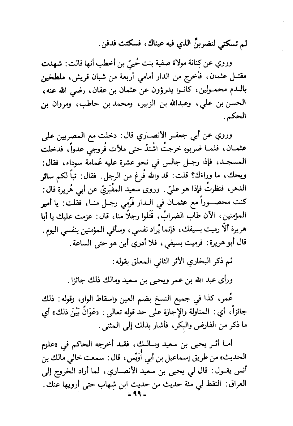 وروي عن أبي جعفر الأنصاري قال: دخلت مع المصريين على عثمان، فلما ضربوه خرجتُ اشْتدّ حتى ملأت فُروجي عدوًا، فدخلت المسجد، فإذا رجل جالس في نحو عشرة عليه عَمامة سوداء، فقال: ويحك، ما وراءَك؟ قلت: قد والله فُرغ من الرجل. فقال: تبًا لكم سائر الدهر، فنظرتُ فإذا هو عليّ. وروى سعيد المقْبَريّ عن أبي هُريرة قال: كنت محصورًا مع عثمان في الدار فَرُمي رجل منا، فقلت: يا أمير المؤمنين، الآن طاب الضرابُ، قَتَلوا رجلًا منا، قال: عزمت عليك يا أبا هريرة ألاّ رميت بسيفك، فإنما يُراد نفسي، وسأقي المؤمنين بنفسي اليوم. قال أبو هريرة: فرميت بسيفي، فلا أدري أين هو حتى الساعة.