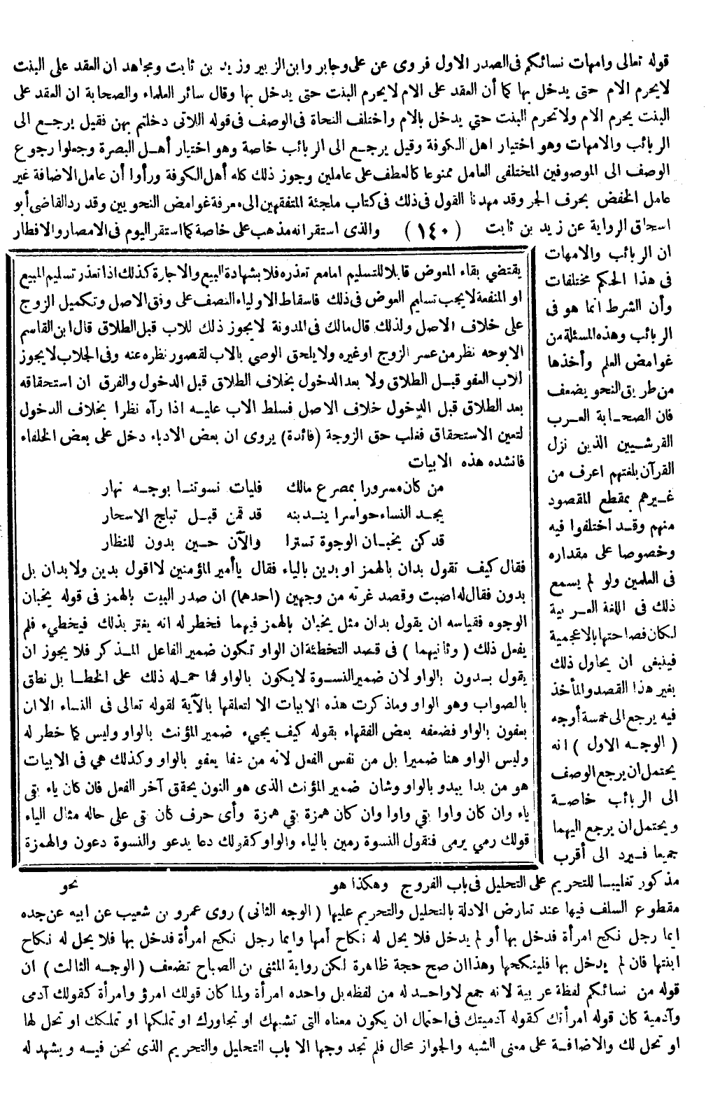 وَهُوَ اخْتِيَارُ أَهْلِ الْبَصْرَةِ وَجَعَلُوا رُجُوعَ الْوَصْفِ إلَى الْمَوْصُوفَيْنِ الْمُخْتَلِفَيْ الْعَامِلِ مَمْنُوعًا كَالْعَطْفِ عَلَى عَامِلَيْنِ وَجَوَّزَ ذَلِكَ كُلَّهُ أَهْلُ الْكُوفَةِ وَرَأَوْا أَنَّ عَامِلَ الْإِضَافَةِ غَيْرُ عَامِلِ الْخَفْضِ بِحَرْفِ الْجَرِّ وَقَدْ مَهَّدْنَا الْقَوْلَ فِي ذَلِكَ فِي كِتَابِ: مُلْجِئَةُ الْمُتَفَقِّهِينَ إلَى مَعْرِفَةِ غَوَامِضِ النَّحْوِيِّينَ وَقَدْ رَدَّ الْقَاضِي أَبُو إِسْحَاقَ الرِّوَايَةَ عَنْ زَيْدِ بْنِ ثَابِتٍ وَاَلَّذِي اسْتَقَرَّ أَنَّهُ مَذْهَبُ عَلِيٍّ خَاصَّةً كَمَا اسْتَقَرَّ الْيَوْمَ فِي الْأَمْصَارِ وَالْأَقْطَارِ أَنَّ الرَّبَائِبَ وَالْأُمَّهَاتِ فِي هَذَا الْحُكْمِ مُخْتَلِفَاتٌ وَأَنَّ الشَّرْطَ إنَّمَا هُوَ فِي الرَّبَائِبِ وَهَذِهِ الْمَسْأَلَةُ مِنْ غَوَامِضِ الْعِلْمِ وَأَخْذُهَا مِنْ طَرِيقِ النَّحْوِ يَضْعُفُ فَإِنَّ الصَّحَابَةَ الْعَرَبَ الْقُرَشِيِّينَ الَّذِينَ نَزَلَ الْقُرْآنُ بِلُغَتِهِمْ أَعْرَفُ مِنْ غَيْرِهِمْ بِمَقْطَعِ الْمَقْصُودِ مِنْهُمْ وَقَدْ اخْتَلَفُوا فِيهِ وَخُصُوصًا عَلَى مِقْدَارِهِ فِي الْعِلْمَيْنِ وَلَوْ لَمْ يُسْمَعْ ذَلِكَ فِي اللُّغَةِ الْعَرَبِيَّةِ لَكَانَ فَصَاحَتُهَا بِالْأَعْجَمِيَّةِ فَيَنْبَغِي أَنْ يُحَاوَلَ ذَلِكَ بِغَيْرِ هَذَا الْقَصْدِ وَالْمَأْخَذُ فِيهِ يَرْجِعُ إلَى خَمْسَةِ أَوْجُهٍ