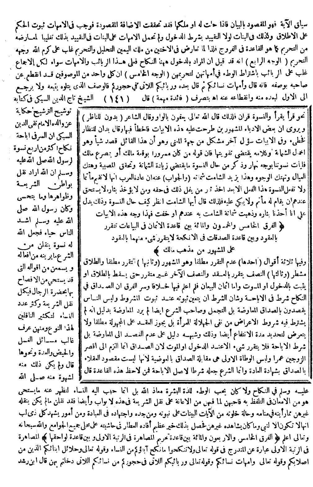 (فَائِدَةٌ مُهِمَّةٌ) قَالَ الشَّيْخُ تَاجُ الدِّينِ السُّبْكِيُّ فِي كِتَابِهِ تَوْشِيحُ التَّرْشِيحِ حِكَايَةً عَنْ وَالِدِهِ الْإِمَامِ تَقِيِّ الدِّينِ السُّبْكِيّ أَنَّ السِّرَّ فِي إبَاحَةِ نِكَاحِ أَكْثَرَ مِنْ أَرْبَعِ نِسْوَةٍ لِرَسُولِ اللَّهِ - صَلَّى اللَّهُ عَلَيْهِ وَسَلَّمَ - أَنَّ اللَّهَ أَرَادَ نَقْلَ بَوَاطِنِ الشَّرِيعَةِ وَظَوَاهِرِهَا وَمَا يَتَحَسَّى وَكَانَ رَسُولُ اللَّهِ - صَلَّى اللَّهُ عَلَيْهِ وَسَلَّمَ - أَشَدَّ النَّاسِ حَيَاءً فَجَعَلَ اللَّهُ لَهُ نِسْوَةً يَنْقُلْنَ مِنْ الشَّرْعِ مَا يَرَيْنَهُ مِنْ أَفْعَالِهِ وَيَسْمَعْنَ مِنْ أَقْوَالِهِ الَّتِي قَدْ يَسْتَحِي مِنْ الْإِفْصَاحِ بِهَا بِحَضْرَةِ الرِّجَالِ فَيَكْمُلُ نَقْلُ الشَّرِيعَةِ وَكَثُرَ عَدَدُ النِّسَاءِ لِتَكْثِيرِ النَّاقِلِينَ لِهَذَا النَّوْعِ وَمِنْهُنَّ عُرِفَ غَالِبُ مَسَائِلِ الْغُسْلِ وَالْحَيْضِ وَالْعِدَّةِ وَنَحْوِهَا قَالَ وَلَمْ يَكُنْ ذَلِكَ مِنْهُ لِشَهْوَةٍ مِنْهُ - صَلَّى اللَّهُ عَلَيْهِ وَسَلَّمَ - فِي النِّكَاحِ وَلَا كَانَ يُحِبُّ الْوَطْءَ لِلَذَّةِ الْبَشَرِ مَعَاذَ اللَّهِ بَلْ إنَّمَا حُبِّبَ إلَيْهِ النِّسَاءُ لِتُظْهِرَ عَنْهُ مَا يَسْتَحِي هُوَ مِنْ الْإِمْعَانِ فِي التَّلَفُّظِ بِهِ فَأَحَبَّهُنَّ لِمَا فِيهِنَّ مِنْ الْإِعَانَةِ عَلَى نَقْلِ الشَّرِيعَةِ فِي هَذِهِ الْأَبْوَابِ وَأَيْضًا فَقَدْ نَقَلْنَ مَا لَمْ يَكُنْ يَنْقُلُهُ غَيْرُهُنَّ مِمَّا رَأَيْنَهُ فِي مَنَامِهِ وَحَالَةِ خَلْوَتِهِ مِنْ الْآيَاتِ الْبَيِّنَاتِ عَلَى نُبُوَّتِهِ وَمِنْ جِدِّهِ وَاجْتِهَادِهِ فِي الْعِبَادَةِ وَمِنْ أُمُورٍ يَشْهَدُ كُلُّ ذِي لُبٍّ أَنَّهَا لَا تَكُونُ إلَّا لِنَبِيٍّ وَمَا كَانَ يُشَاهِدُهُ غَيْرُهُنَّ فَحَصَلَ بِذَلِكَ خَيْرٌ عَظِيمٌ أَفَادَهُ الْعَطَّارُ فِي حَاشِيَتِهِ عَلَى مَحَلِّيٍّ جَمْعِ الْجَوَامِعِ وَاَللَّهُ سُبْحَانَهُ وَتَعَالَى أَعْلَمُ.