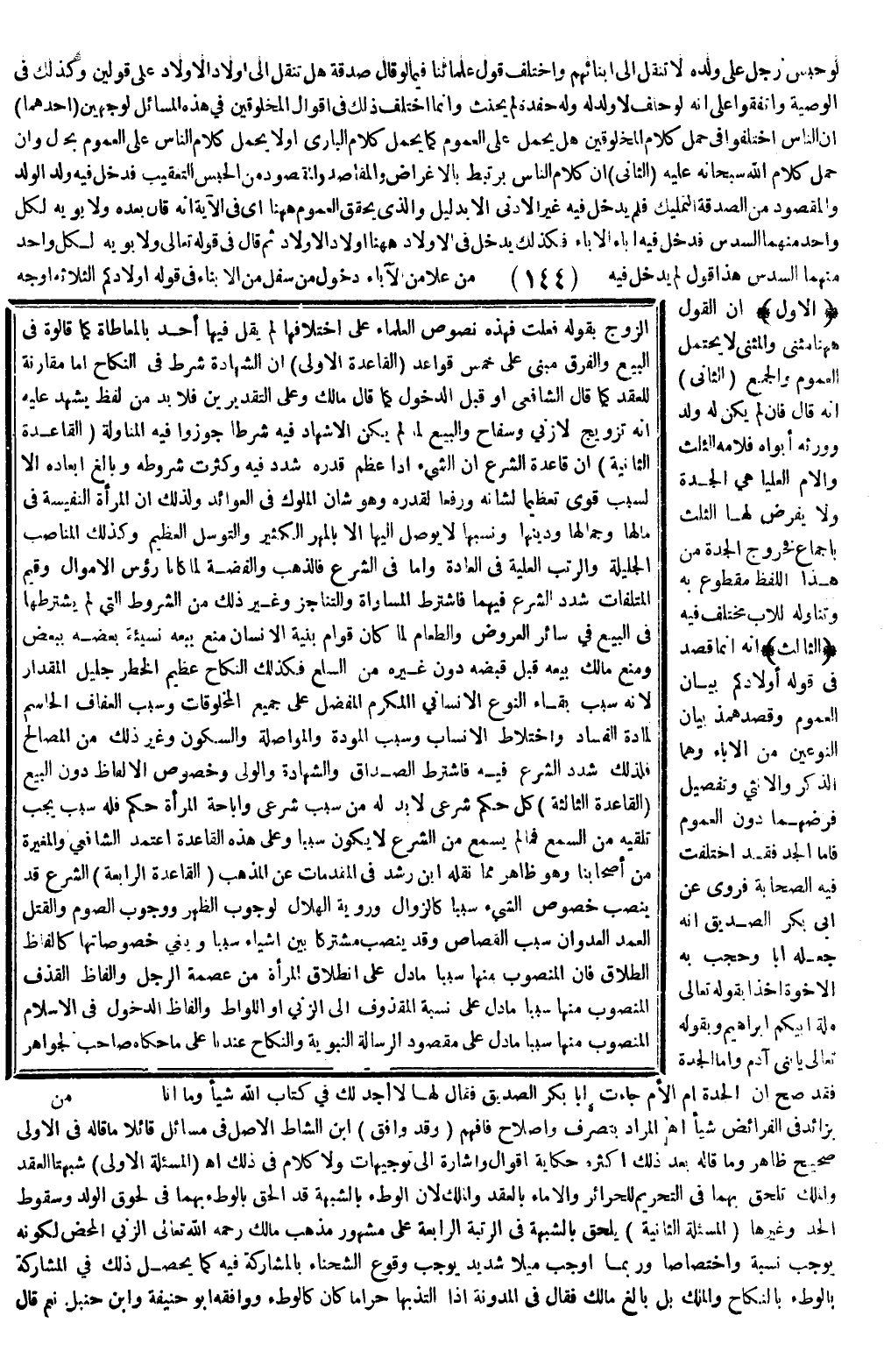 (الثَّالِثُ) أَنَّهُ إنَّمَا قَصَدَ فِي قَوْلِهِ {أَوْلادِكُمْ} [النساء: 11] بَيَانَ الْعُمُومِ وَقَصَدَ هُنَا بَيَانُ النَّوْعَيْنِ مِنْ الْآبَاءِ وَهُمَا الذَّكَرُ وَالْأُنْثَى وَتَفْصِيلُ فَرْضِهِمَا دُونَ الْعُمُومِ فَأَمَّا الْجَدُّ فَقَدْ اخْتَلَفَتْ فِيهِ الصَّحَابَةُ فَرُوِيَ عَنْ أَبِي بَكْرٍ الصِّدِّيقِ أَنَّهُ جَعَلَهُ أَبًا وَحَجَبَ بِهِ الْإِخْوَةَ أَخْذًا بِقَوْلِهِ تَعَالَى {مِلَّةَ أَبِيكُمْ إِبْرَاهِيمَ} [الحج: 78] وَبِقَوْلِهِ تَعَالَى {يَا بَنِي آدَمَ} [الأعراف: 26] وَأَمَّا الْجَدَّةُ فَقَدْ صَحَّ أَنَّ الْجَدَّةَ أُمَّ الْأُمِّ جَاءَتْ أَبَا بَكْرٍ الصِّدِّيقَ فَقَالَ لَهَا لَا أَجِدُ لَك فِي كِتَابِ اللَّهِ شَيْئًا وَمَا أَنَا بِزَائِدٍ فِي الْفَرَائِضِ شَيْئًا. اهـ