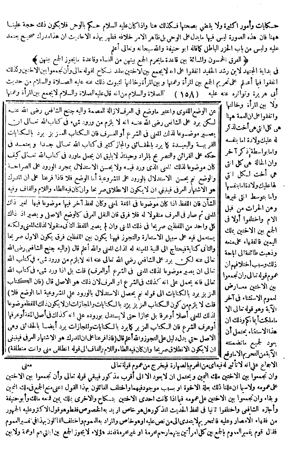 وَاخْتَلَفُوا ثَانِيًا فِي لَفْظِ الْحَدِيثِ الْمَذْكُورِ هَلْ هُوَ خَاصٌّ أُرِيدَ بِهِ الْخُصُوصُ فَقَطْ وَهُوَ قَوْلُ الْأَكْثَرِ وَعَلَيْهِ الْجُمْهُورُ مِنْ فُقَهَاءِ الْأَمْصَارِ وَعَلَيْهِ فَالتَّحْرِيمُ لَا يَتَعَدَّى إلَى مَنْ نَصَّ عَلَيْهِ أَوْ هُوَ خَاصٌّ وَالْمُرَادُ بِهِ الْعُمُومُ وَاخْتَلَفَ الْقَائِلُونَ بِهَذَا فِي تَفْسِيرِ الْعُمُومِ فَقَالَ قَوْمٌ يُفَسَّرُ الْعُمُومُ بِالْجَمْعِ بَيْنَ كُلِّ امْرَأَتَيْنِ بَيْنَهُمَا رَحِمٌ مُحَرَّمَةٌ أَوْ غَيْرُ مُحَرَّمَةٍ فَعِنْدَ هَؤُلَاءِ لَا يَجُوزُ الْجَمْعُ بَيْنَ ابْنَتِي عَمٍّ أَوْ عَمَّةٍ وَلَا بَيْنَ