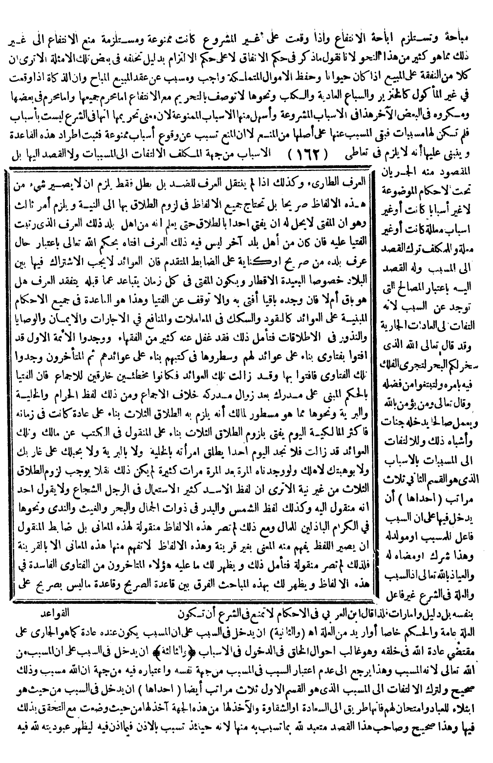 (إحْدَاهَا) أَنْ يَدْخُلَ فِيهَا عَلَى أَنَّ السَّبَبَ فَاعِلٌ لِلْمُسَبَّبِ أَوْ مَدْلُولِهِ وَهَذَا شِرْكٌ أَوْ مُضَاهٍ لَهُ وَالْعِيَاذُ بِاَللَّهِ تَعَالَى إذْ السَّبَبُ وَالْعِلَّةُ فِي الشَّرْعِ غَيْرُ فَاعِلٍ بِنَفْسِهِ بَلْ دَلِيلٌ وَأَمَارَةٌ فَلِذَا قَالَ ابْنُ الْعَرَبِيِّ فِي الْأَحْكَامِ لَا تُمْنَعُ فِي الشَّرْعِ أَنْ تَكُونَ الْعِلَّةُ عَامَّةً وَالْحُكْمُ خَاصًّا أَوْ أُرِيدَ مِنْ الْعِلَّةِ. اهـ