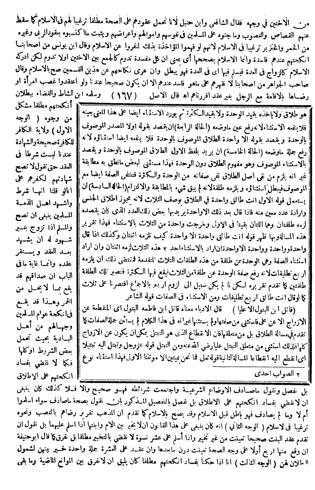 قَالَ الْأَصْلُ سَلَّمَهُ ابْنُ الشَّاطِّ وَالْقَضَاءُ بِبُطْلَانِ أَنْكِحَتِهِمْ مُطْلَقًا مُشْكِلٌ مِنْ وُجُوهٍ