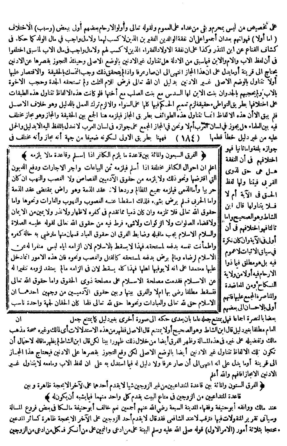 وَأَمَّا ثَانِيًا فَهُوَ اخْتِلَافُهُمْ فِي أَنَّ النَّفَقَةَ هَلْ هِيَ حَقٌّ لِذَوِي الْقُرْبَى فَيَتَنَاوَلُهَا لَفْظُ الْحَقِّ فِي الْآيَةِ أَمْ لَا فَلَا يَتَنَاوَلُهَا قَالَ ابْنُ الشَّاطِّ وَهُوَ الصَّحِيحُ وَأَمَّا ثَالِثًا فَهُوَ اخْتِلَافُهُمْ فِي أَنَّ أَوْلَى فِي الْآيَةِ وَإِنْ كَانَ نَكِرَةً فِي سِيَاقِ الْإِثْبَاتِ لَا عُمُومَ فِيهِ بَلْ هُوَ مُطْلَقٌ فِيمَا ذَوُو الْأَرْحَامِ فِيهِ أَوْلَى مِنْ وِلَايَةِ النِّكَاحِ وَمِنْ الْمُعَاضَدَةِ وَالْمُنَاصَرَةِ الْمُجْمَعِ عَلَيْهَا فَإِنَّهُمْ أَوْلَى بِالْإِحْسَانِ إلَى بَعْضِهِمْ بَعْضًا بِالنُّصْرَةِ إجْمَاعًا فَهَلْ يَمْتَنِعُ جَعْلُهُ عَامًّا بِأَنْ يُعَدَّى حُكْمُهُ إلَى صُورَةٍ أُخْرَى بِغَيْرِ دَلِيلٍ كَمَا يَمْتَنِعُ جَعْلُ الْعَامِّ مُطْلَقًا بِغَيْرِ دَلِيلٍ قَالَ ابْنُ الشَّاطِّ وَهُوَ الصَّحِيحُ أَوْ لَا يَمْتَنِعُ.