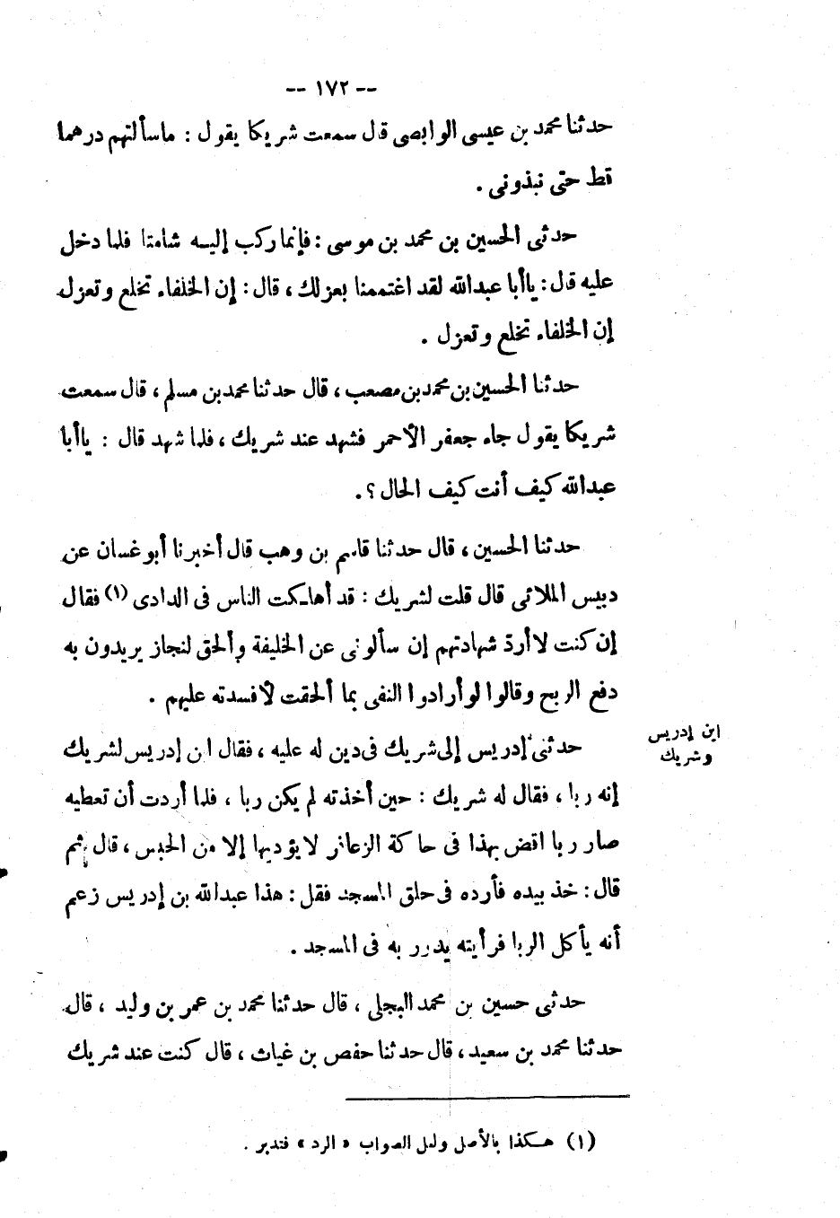 حَدَّثَنِي إدريس (؟؟؟) إِلَى شريك في دين له عليه، فَقَالَ ابن إدريس لشريك: إنه ربا، فَقَالَ لَهُ شريك: حين أخذته لم يكن ربا، فلما أردت أن تعطيه صار ربا اقض بهَذَا في حاكة الزعافر لا يؤديها إِلَّا من الحبس، قَالَ: ثم قال: خذ بيده فأرده في حلق المسجد فقال: هَذَا عَبْد اللهِ بْن إدريس زعم أنه يأكل الربا فرايته يدرر به في المسجد.