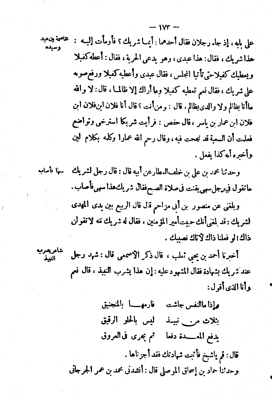 أَخْبَرَنَا أَحْمَد بْن يحيى ثعلب، قَالَ: ذكر الأصمعي قال: شهد رجل عند شريك بشهادة فَقَالَ: المشهود عليه: إن هَذَا يشرب النبيذ، قَالَ: نعم وأنا الذي أقول: