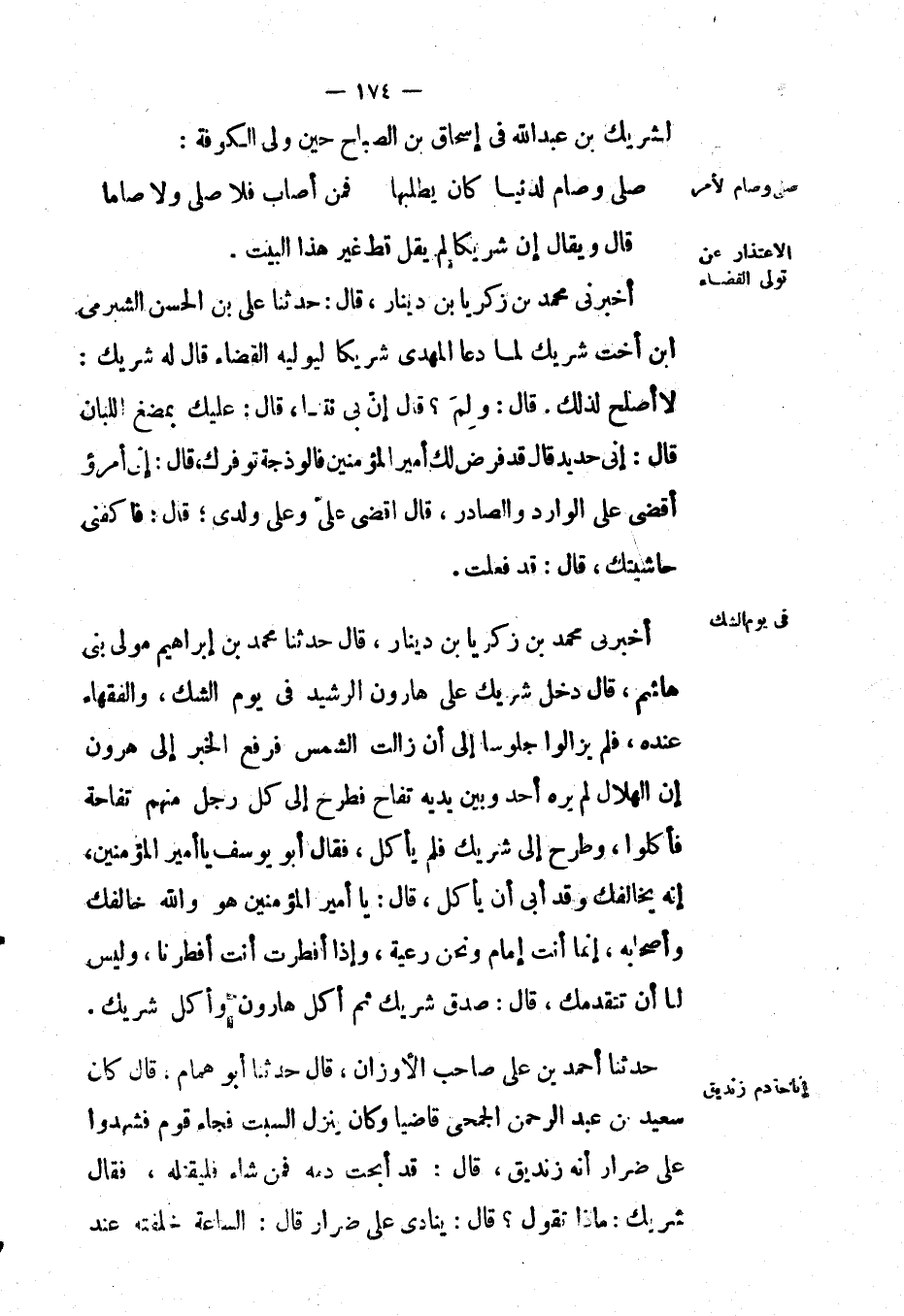 أَخْبَرَنِي مُحَمَّد بْن زكريا بْن دينار، قَالَ: حَدَّثَنَا مُحَمَّد بْن إبراهيم مولى بني هاشم، قَالَ: دخل شريك على هارون الرشيد في يوم الشك، والفقهاء عنده، فلم يزالوا جلوساً إِلَى أن زالت الشمس فرفع الخبر إِلَى هارون إن الهلال لم يره أحد وبين يديه تفاح فطرح إِلَى كل رجل منهم تفاحة فأكلوا، وطرح إِلَى شريك فلم يأكل، فَقَالَ أَبُو يوسف: يا أمير المؤمنين، إنه يخالفك وقد أبى أن يأكل، قال: يا أمير المؤمنين هو والله خالفك وأصحابه، إنما أنت إمام ونحن رعية، وإذا أفطرت أنت أفطرنا، وليس لنا أن نتقدمك، قال: صدق شريك ثم أكل هارون وأكل شريك.