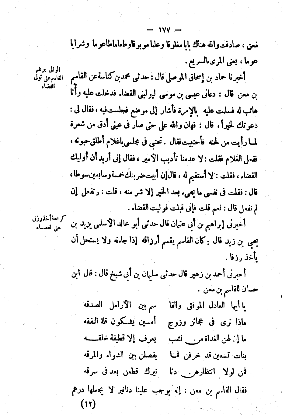 أَخْبَرَنَا حماد بْن إسحاق الموصلي قال: حَدَّثَنِي مُحَمَّد بْن كناسة عَن القاسم بْن معن قال: دعاني عيسى بْن موسى ليوليني القضاء فدخلت عليه وأنا هائب له فسلمت عليه بالإمرة فأشار إِلَى موضع فجلست فيه، فَقَالَ لي: دعوتك لخيراً، قال: فهان والله علي حتى صار في عيني أدق من شعرة لما رأيت من لحنه فأحتبيت فقال: تحتبي في مجلسي يا غلام أطلق حبوته" ففعل الغلام فقلت: لا عدمنا تأديب الأمير، فَقَالَ: إني أريد أن أوليك القضاء، فقلت: لا أستقيم له، قَالَ: إن أبيت ضربتك خمسة وسبعين سوطاً، قال: فقلت في نفسي ما يجىء بعد الخير إِلَّا شر منه، قلت: وتفعل إن لم نفعل قال: نعم قلت: فإني قبلت فوليت القضاء.