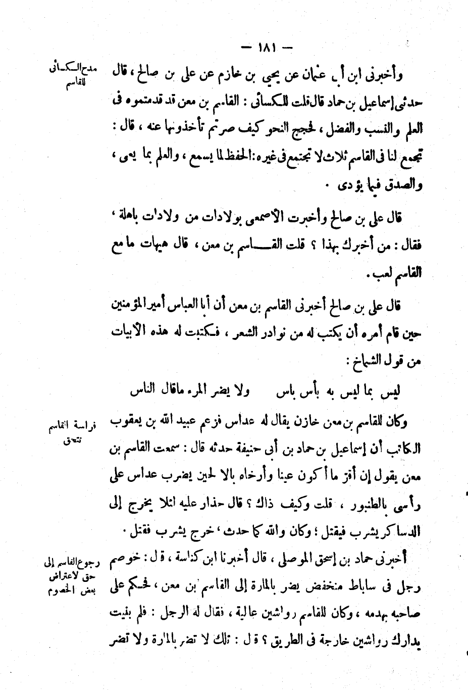 وأَخْبَرَنِي ابن أبي عُثْمَان عَن يحيى بْن خازم عَن علي بْن صالح، قَالَ: حَدَّثَنِي إسماعيل بْن حماد قَالَ: قلت للكسائي: القاسم بْن معن قد قدمتموه في العلم والنسب والفضل، فحجج النحو كيف صرتم تأخذونها عنه، قال: تجمع لنا في القاسم ثلاث لا تجتمع في غيره: الحفظ لما يسمع، والعلم بما يعي، والصدق فيما يؤدي.