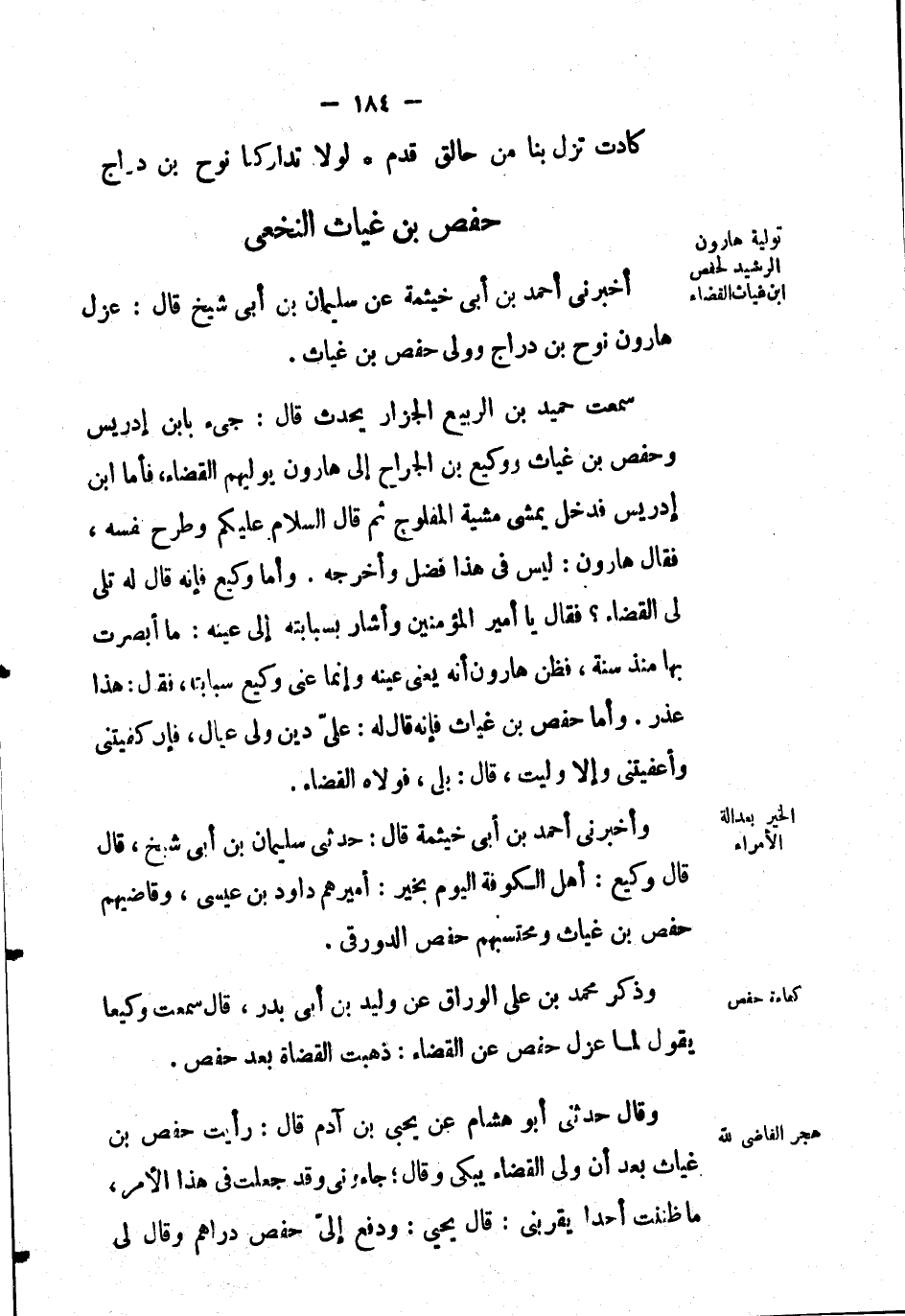 وذكر مُحَمَّد بْن علي الوراق عَن وليد بْن أبي بدر، قَالَ: سمعت وكيعاً يقول لما عزل حفص عَن القضاء: ذهبت القضاة بعد حفص.