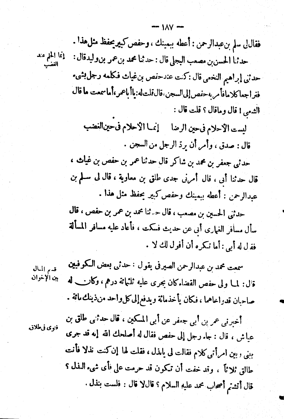 أَخْبَرَنِيَعْمُر بْن أبي جعفر عَن أبي المسكين، قَالَ: حَدَّثَنِي طلق بْن عياش، قال: جاء رجل إِلَى حفص فَقَالَ لَهُ: أصلحك الله إنه قد جرى بيني وبين امرأتي كلام فقالت لي: يا نذل، فقلت لها: إن كنت نذلاً فأنت طالق ثلاثاً، وقد خفت أن تكون قد حرمت علي فأي شيء النذل ? قَالَ: أتشتم أصحاب مُحَمَّد عليه السلام ? قَالَ: لا قال: فلست بنذل.