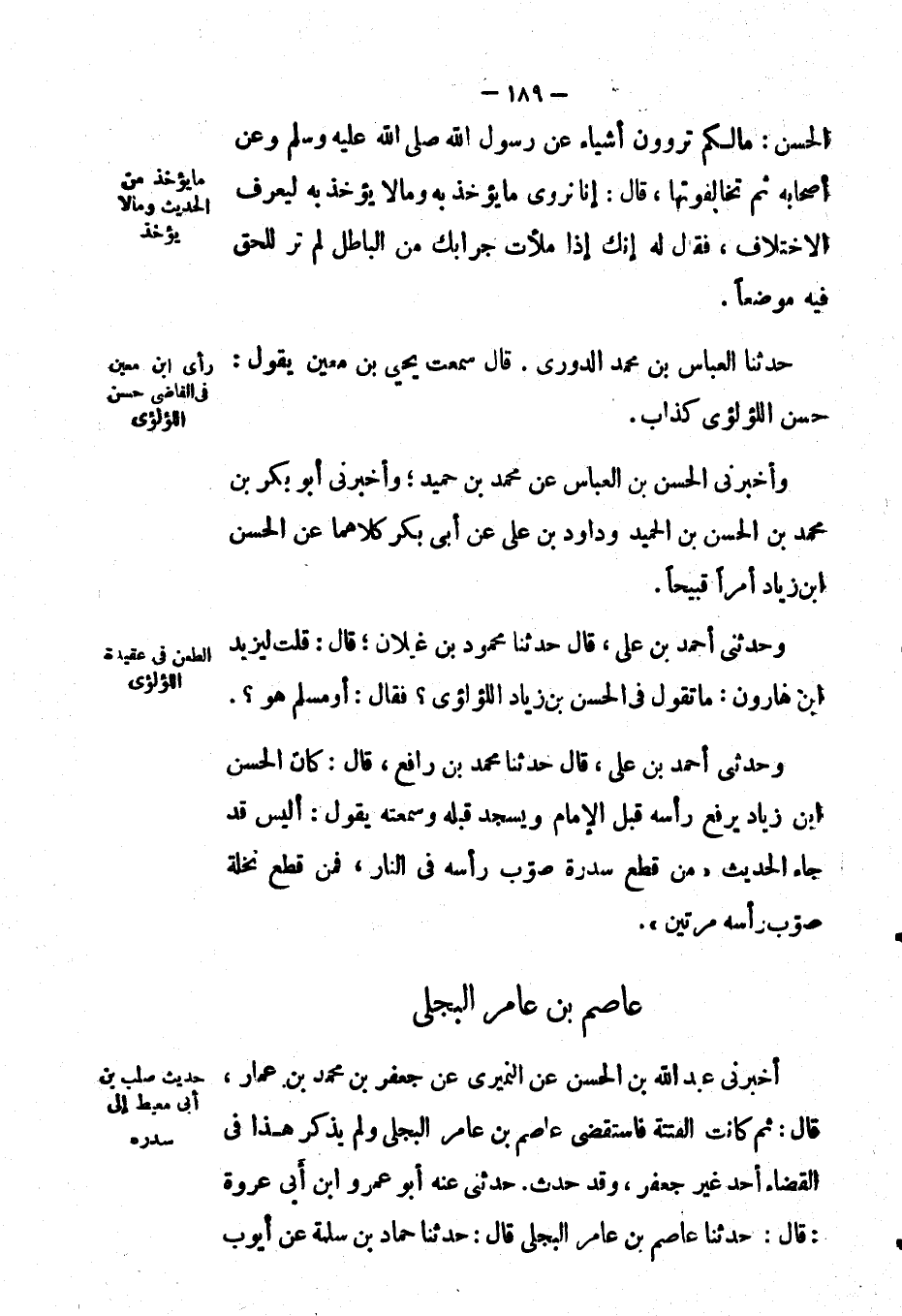 وأَخْبَرَنِي أَبُو بكر بْن مُحَمَّد بْن الْحَسَن بْن الحميد وداود بْن علي عَن أبي بكر كلاهما عَن الْحَسَنِ بْن زِيَاد أمراً قبيحاً.