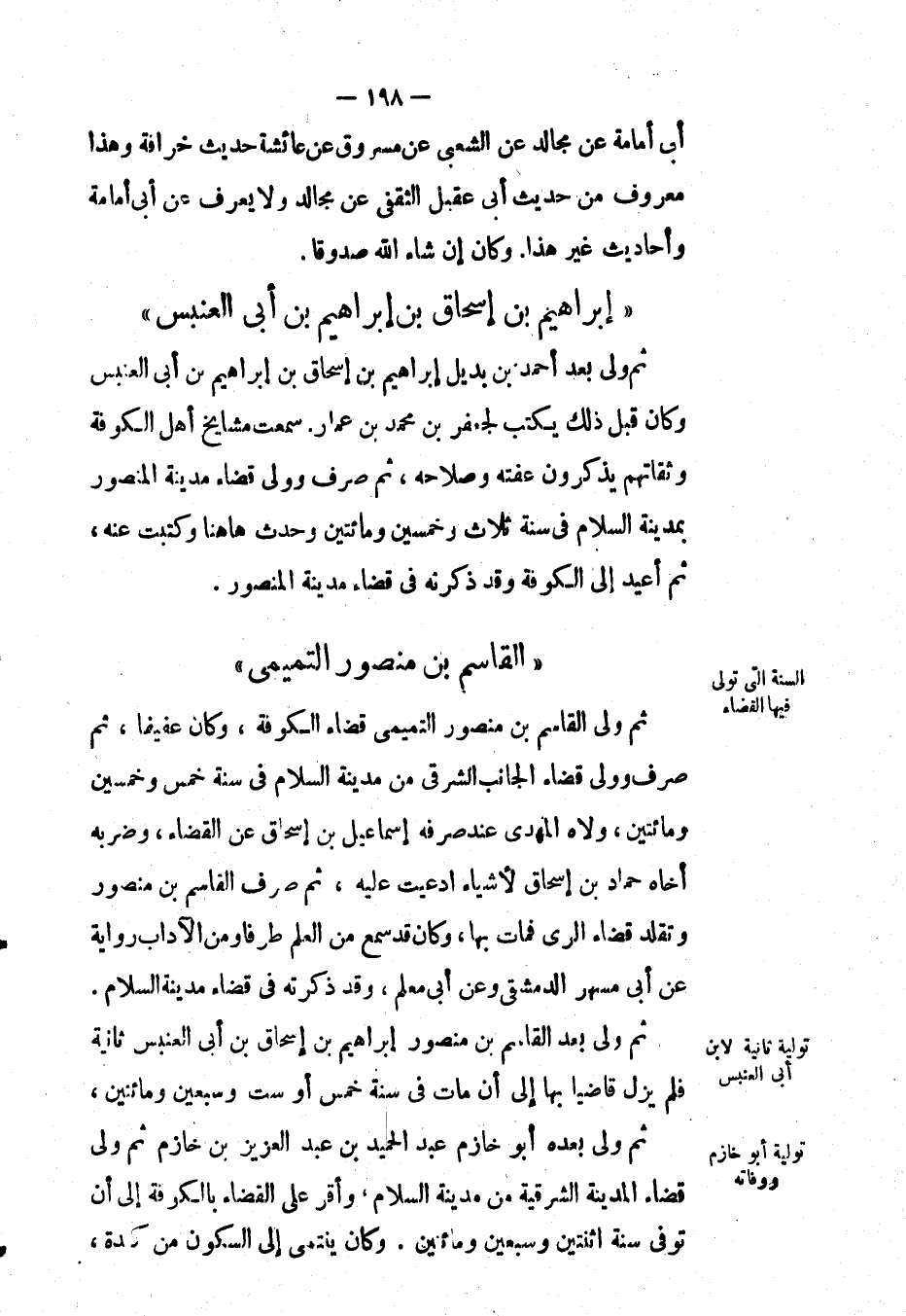 ... ثم ولي القاسم بْن منصور التميمي قضاء الكوفة، وكان عفيفاً، ثم صرف وولي قضاء الجانب الشرقي من مدينة السلام في سنة خمس وخمسين ومائتين.