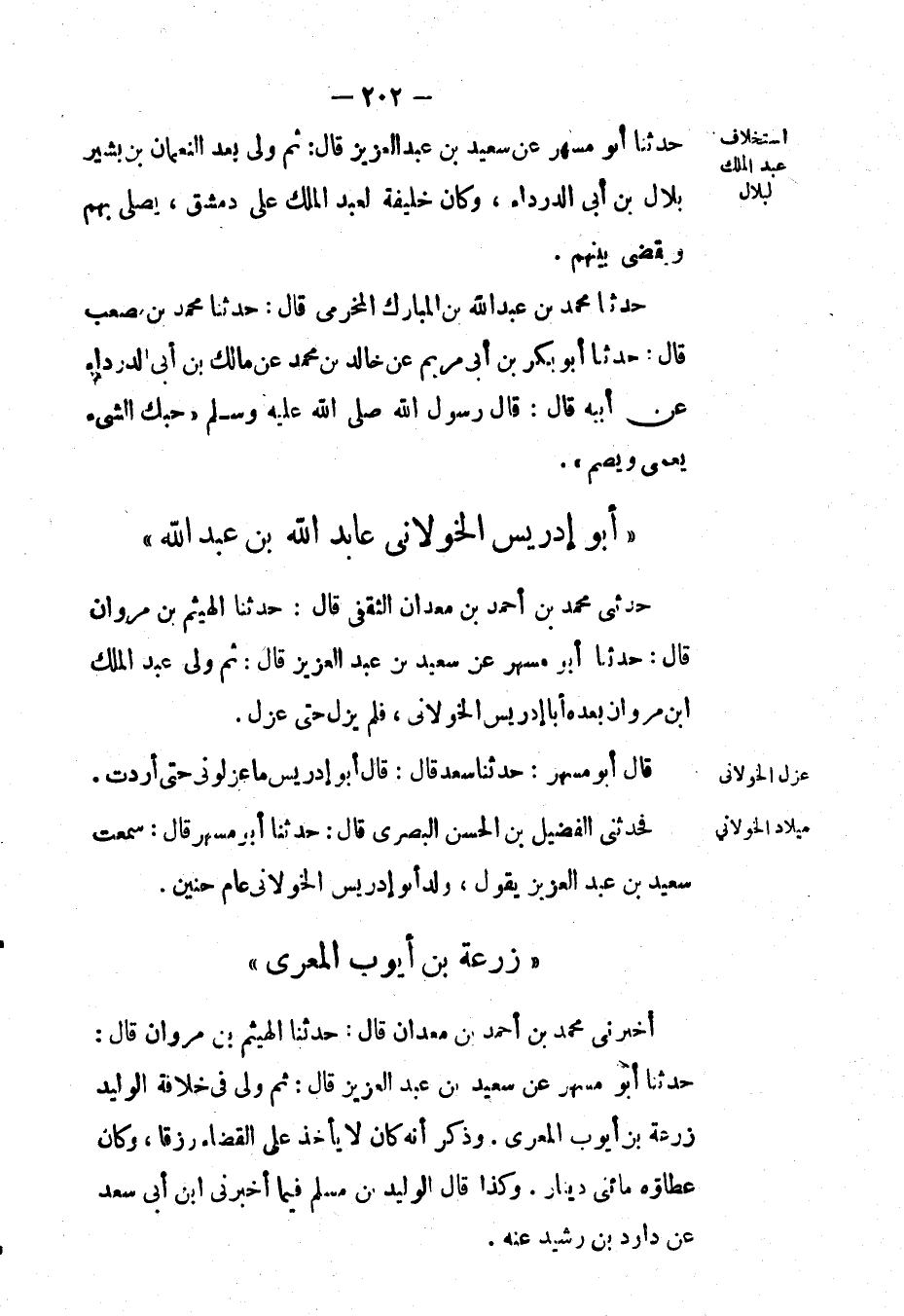 حَدَّثَنِي مُحَمَّد بْن أَحْمَد بْن معدان الثقفي قال: حَدَّثَنَا الهيثم بْن مروان قال: حَدَّثَنَا أَبُو مسهر عَن سعيد بْن عَبْد العزيز قال: ثم ولي عَبْد الملك بن مروان بعده أبا إدريس الخولاني، فلم يزل حتى عزل.