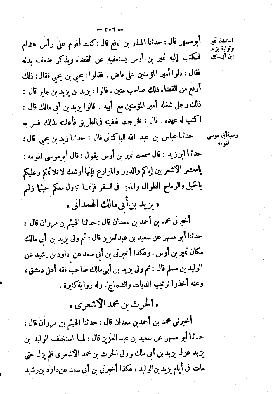 أَخْبَرَنِي مُحَمَّد بْن أَحْمَد بْن معدان قال: حَدَّثَنَا الهيثم بْن مروان قال: حَدَّثَنَا أَبُو مسهر عَن سعيد بْن عَبْد العزيز قال: ثم ولي يزيد بْن أبي مالك مكان نمير بْن أوس.