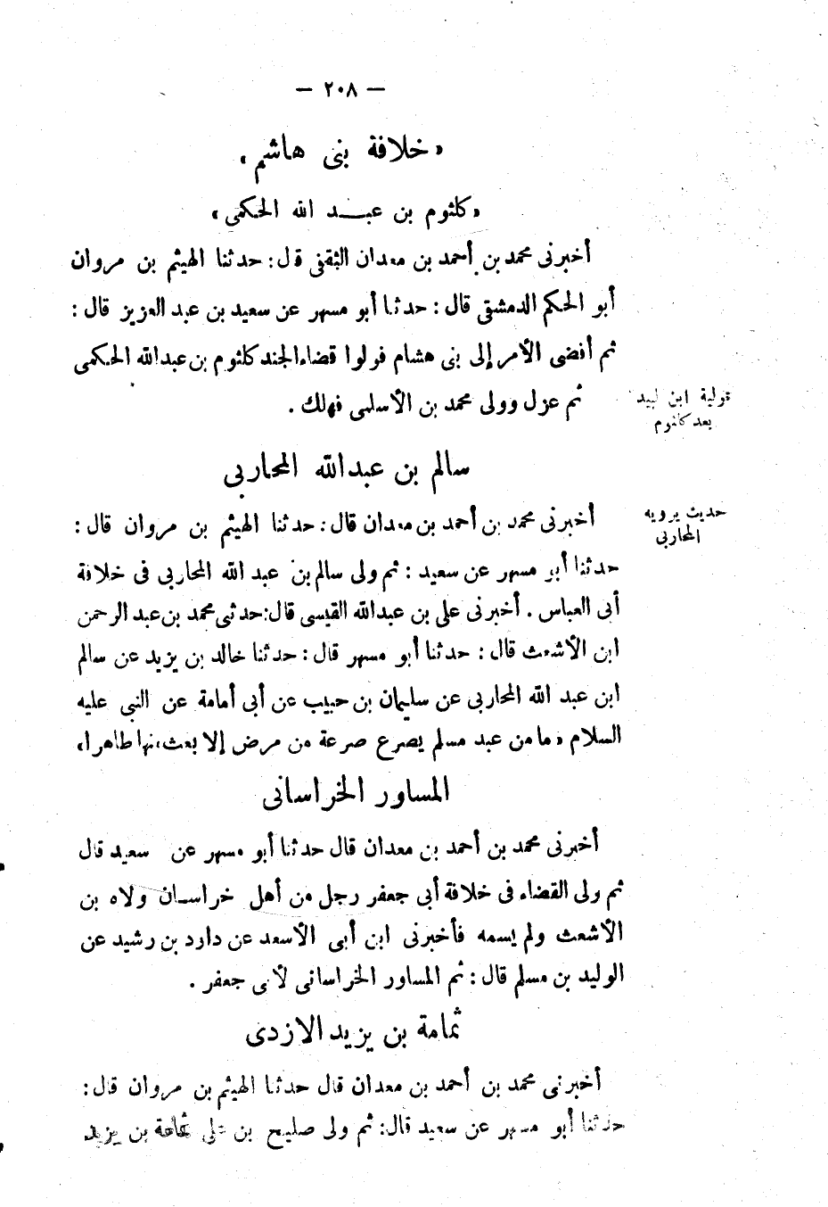 أَخْبَرَنِي مُحَمَّد بْن أَحْمَد بْن معدان قال: حَدَّثَنَا الهيثم بْن مروان قال: حَدَّثَنَا أَبُو مسهر عَن سعيد: ثم ولي سالم بْن عَبْد اللهِ المحاربي في خلافة أبي العباس.