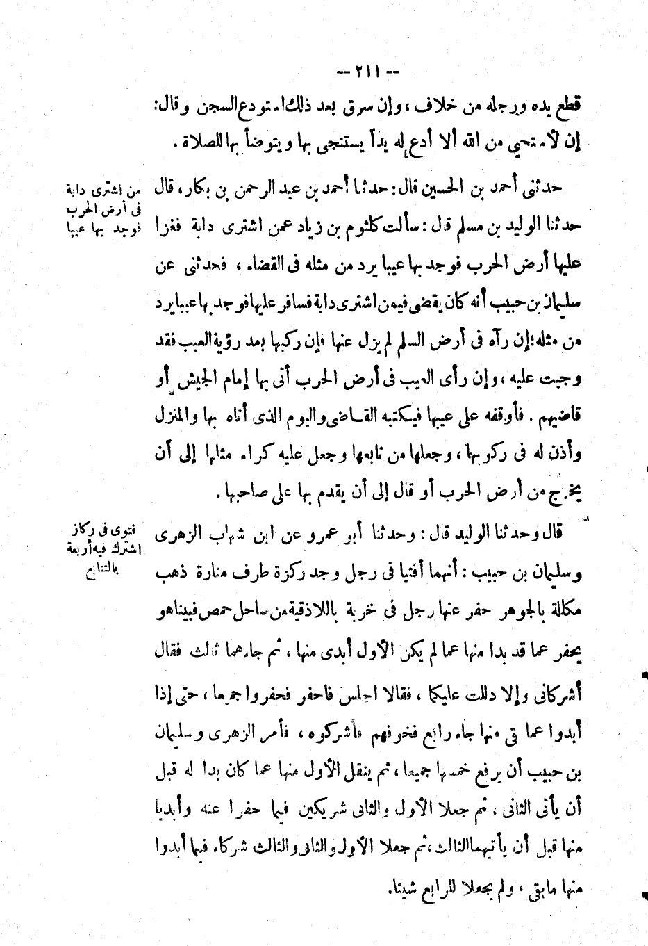 قَالَ: وَحَدَّثَنَا الوليد قال: وَحَدَّثَنَا أَبُو عَمْرو عَن ابن شهاب الزهري وسليمان بْن حبيب: أنهما أفتيا في رجل وجد ركزة طرف منارة ذهب مكللة بالجوهر حفر عنها رجل في خربة باللاذقية من ساحل حمص فبينا هو يحفر عما قد بدا منها عما لم يكن الأول أبدى منها، ثم جاءهما ثالث فَقَالَ: أشركاني وإلا دللت عليكما، فقالا: اجلس فاحفر فحفروا جميعاً، حتى إِذَا أبدوا عما بقي منها جاء رابع فخوفهم فأشركوه فأمر الزهري وسليمان بْن حبيب أن يرفع خمسها جميعاً، ثم ينقل الأول منها عما كان بدا له قبل أن يأتي الثاني، ثم جعلا الأول والثاني شريكين فيما حفرا عنه وأبديا منها قبل أن يأتيهما الثالث، ثم جعلا الأول والثاني والثالث شركاء فيما أبدوا منها ما بقى، ولم يجعلا للرابع شيئاً.