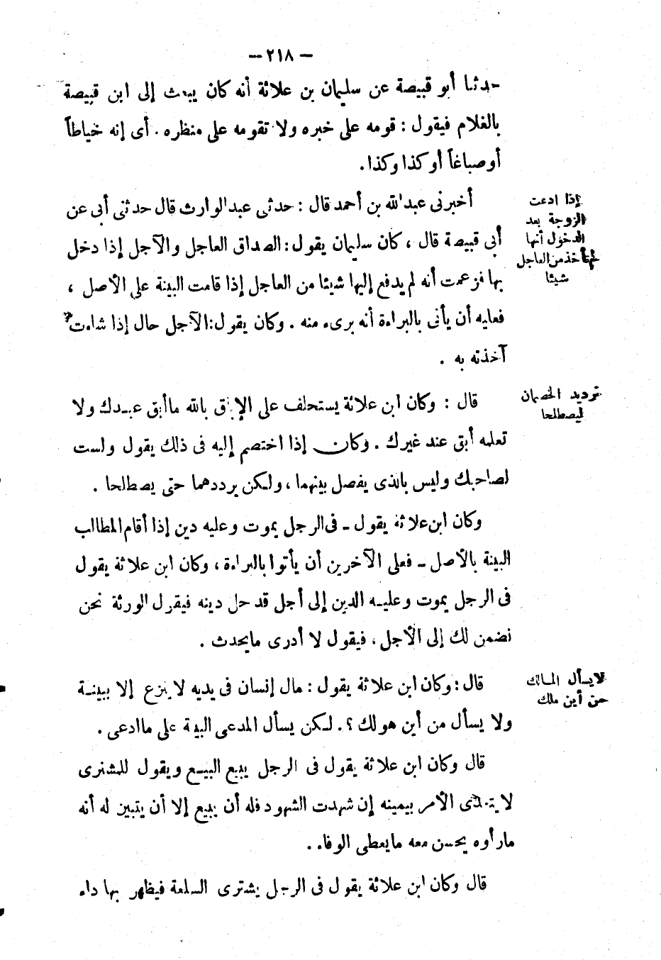وكان ابن علاثة يقول في الرجل يموت وعليه دين: إِذَا أقام المطالب البينة بالأصل فعلى الآخرين أن يأتوا بالبراءة،.