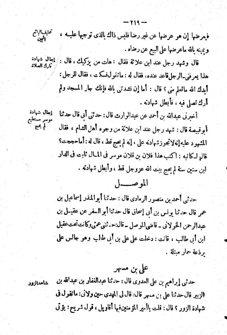 حَدَّثَنِي إبراهيم بْن علي العدوي قال: حَدَّثَنَا عَبْدُ الغفار بْن عَبْد اللهِ بْن الزبير قَالَ: حَدَّثَنَا علي بْن مسهر قال: قَالَ لي المهدي حين ولاني: ما تقول في شهادة الزور ? قال: قلت يا أمير المؤمنين فيها أقاويل، قول شريح: يؤتى