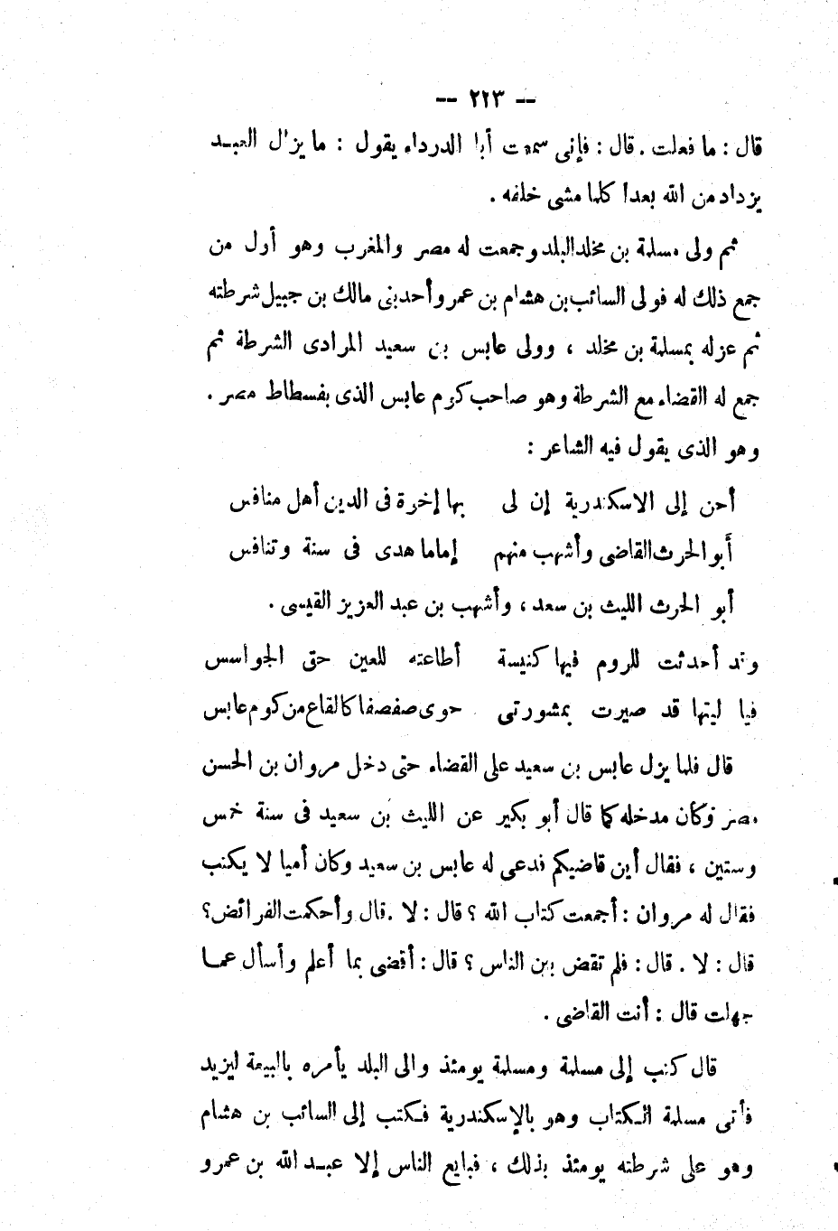 قَالَ: كتب إِلَى مسلمة ومسلمة يومئذ والي البلد يأمره بالبيعة ليزيد فأتى مسلمة الكتاب وهو بالإسكندرية فكتب إِلَى السائب بْن هشام وهو على شرطته يومئذ بذلك، فبايع الناس إِلَّا عَبْد اللهِ بْن عَمْرو