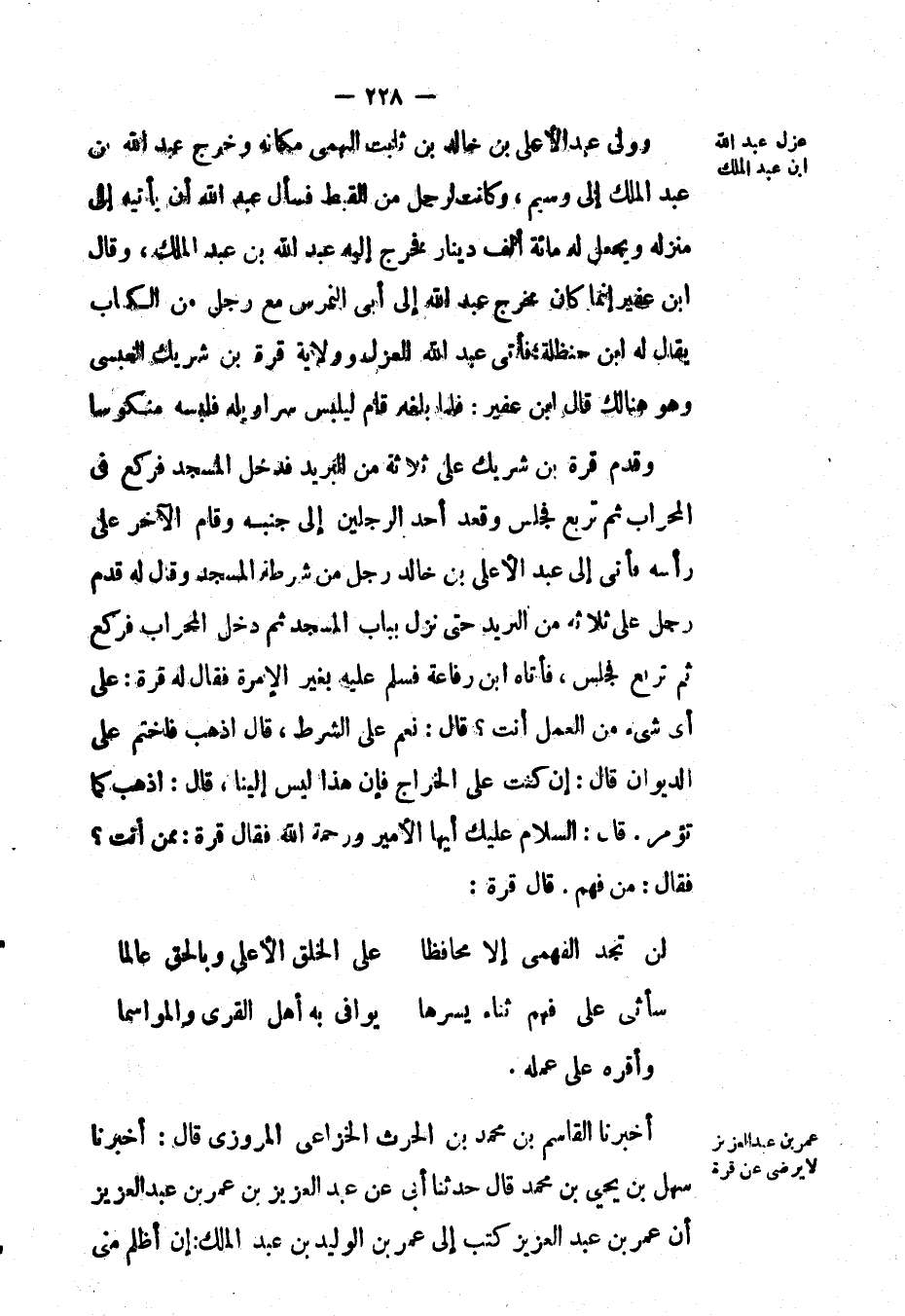 وولي عَبْد الأعلى بْن خالد بْن ثابت الهمي مكانه وخرج عَبْد اللهِ بْن عَبْد الملك إِلَى وسيم، وكانت لرجل من القبط فسأل عَبْد اللهِ أن يأتيه إِلَى منزله ويجعل له مائة ألف دينار فخرج إليه عَبْد اللهِ بْن عَبْد الملك، وقَالَ ابن عفير: إنما كان مخرج عَبْد اللهِ إِلَى أبي النمرس مع رجل من الكتاب يُقَالُ له: ابن حنظلة؛ فأتى عَبْد اللهِ للعزل وولاية قرة بْن شريك العبسي وهو هنالك. قَالَ ابن عفير: فلما بلغه قام ليلبس سراويله فلبسه منكوساً وقدم قرة بْن شريك على ثلاثة من البريد فدخل المسجد فركع في المحراب ثم تربع فجلس وقعد أحد الرجلين إِلَى جنبه وقام الآخر على رأسه فأتى إِلَى عَبْدِ الأعلى بْن خالد رجل من شرطة المسجد وقَالَ له: قدم رجل على ثلاثة من البريد حتى نزل بباب المسجد ثم دخل المحراب فركع ثم تربع فجلس، فأتاه ابن رفاعة فسلم عليه بغير الإمرة فَقَالَ لَهُ قرة: على أي شيء من العلم أنت ? قال: نعم على الشرط، قَالَ: اذهب فاختم على الديوان قال: إن كنت على الخراج فإن هَذَا ليس إلينا، قال: اذهب كما تؤمر. قال: السلام عليك أيها الأمير ورحمة الله فَقَالَ قرة: ممن أنت ? فقال: من فهم. قَالَ قرة: