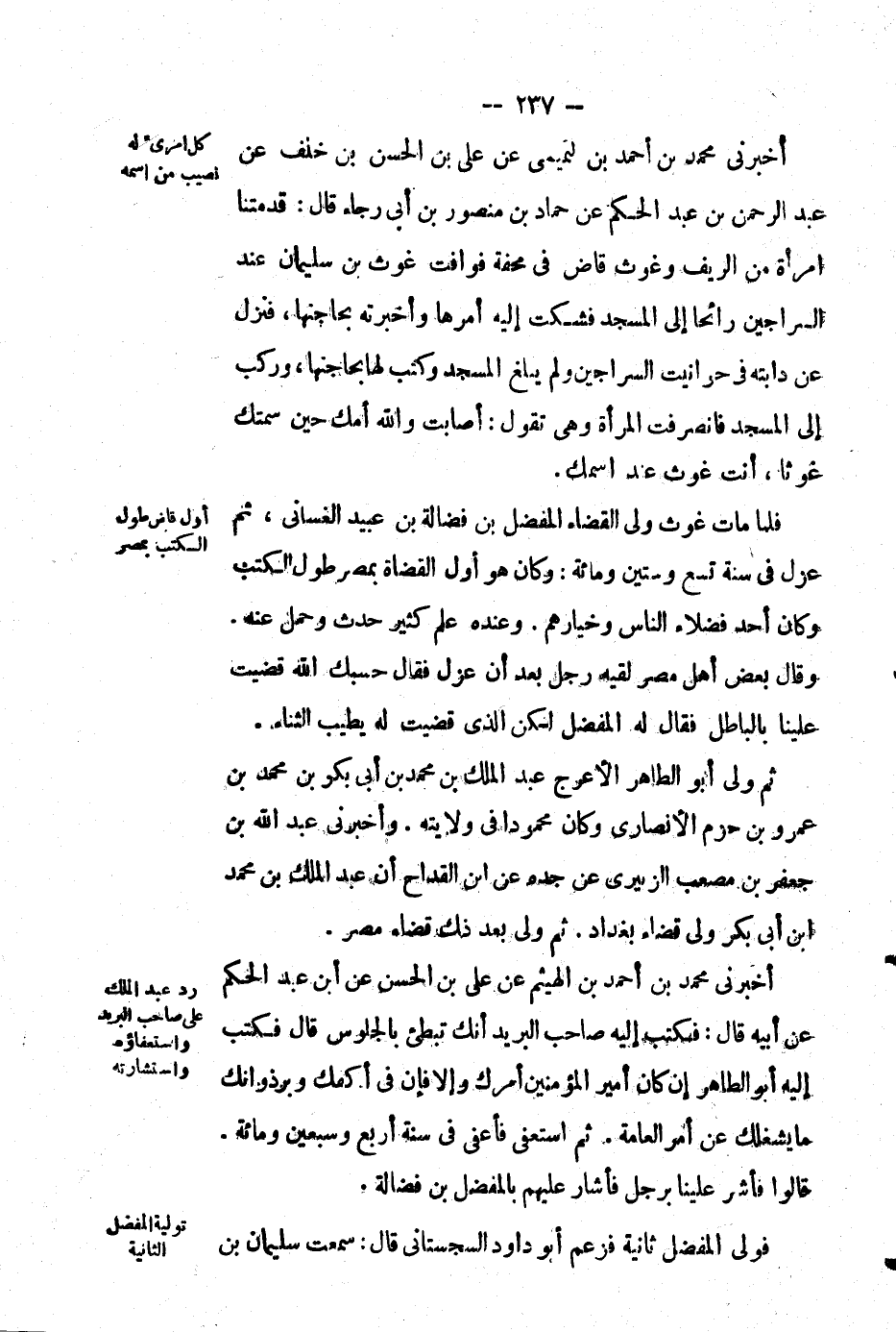 أَخْبَرَنِي مُحَمَّد بْن أَحْمَد بْن الهيثم عَن علي بْن الْحَسَن عَن ابن عَبْد الحكم عَن أبيه قال: فكتب إليه صاحب البريد: أنك تبطئ بالجلوس قَالَ: فكتب إليه أَبُو الطاهر إن كان أمير المؤمنين أمرك وإلا فإن في أكفك وبرذوانك ما يشغلك عَن أمر العامة. ثم استعفى فأعفى في سنة أربع وسبعين ومائة. قالوا: فأشر علينا برجل" فأشار عليهم بالمفضل بْن فضالة.