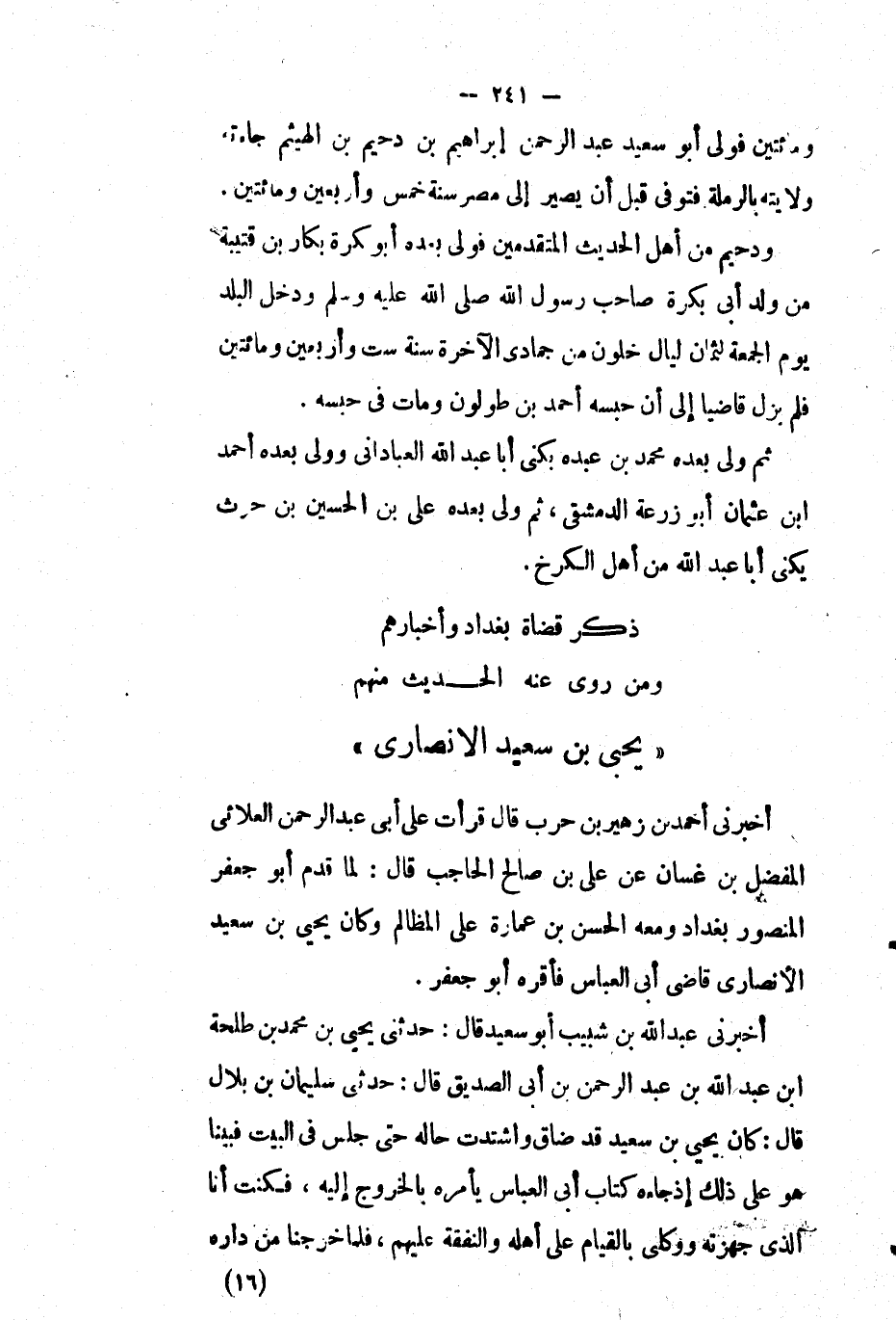 أَخْبَرَنِي أَحْمَد بْن زهير بْن حرب قَالَ: قرأت على أبي عَبْد الرحمن العلائي المفضل بْن غسان عَن علي بْن صالح الحاجب قال: لما قدم أَبُو جعفر المنصور بغداد ومعه الْحَسَن بْن عمارة على المظالم وكان يحيى بْن سعيد الأنصاري قاضي أبي العباس فأقره أَبُو جعفر.