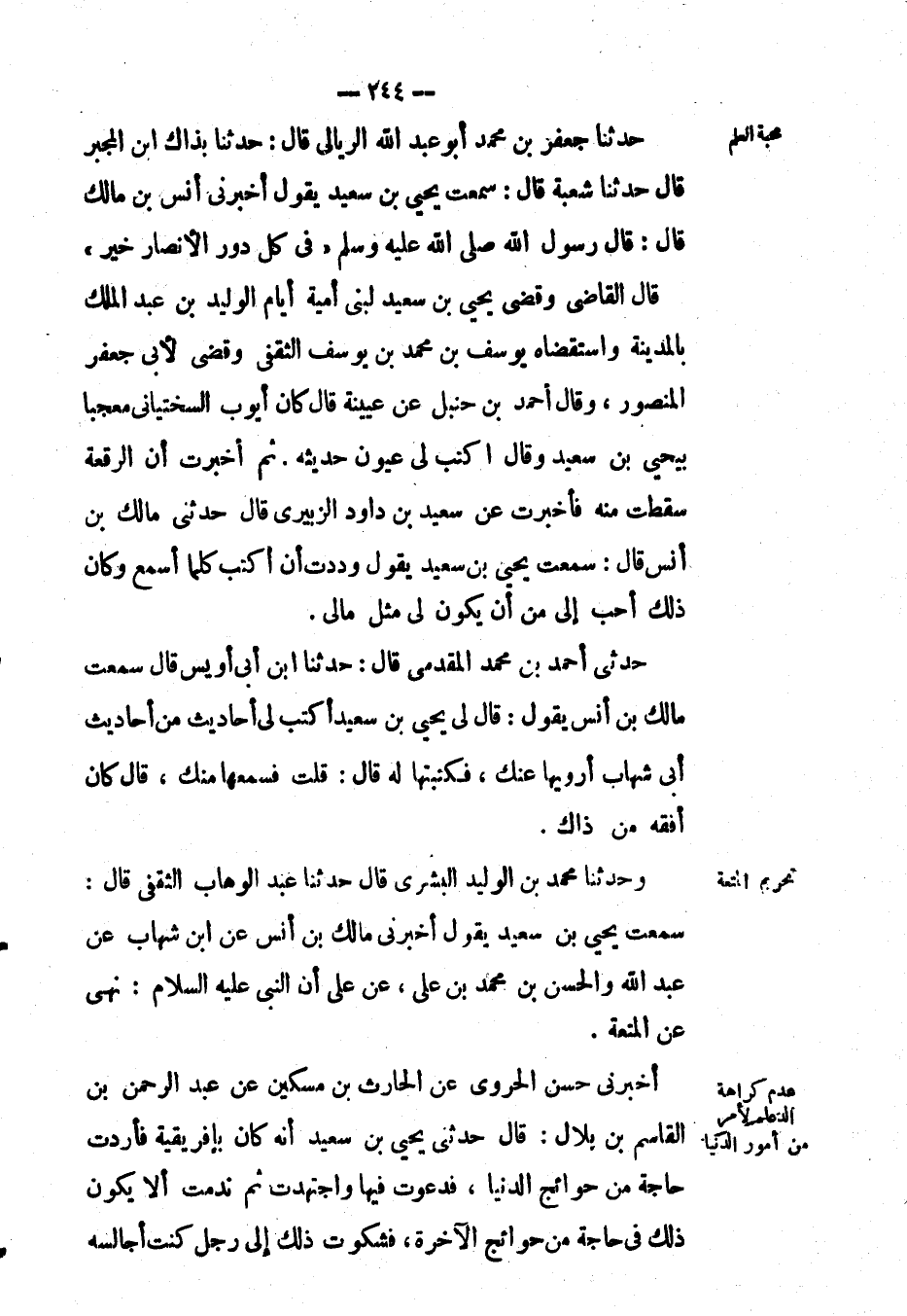 ثم أخبرت أن الرقعة سقطت منه فأخبرت عَن سعيد بْن داود الزبيري قَالَ: حَدَّثَنِي مالك بْن أنس قال: سمعت يحيى بْن سعيد يقول: وددت أن أكتب كلما أسمع وكان ذلك أحب إلي من أن يكون لي مثل مالي.