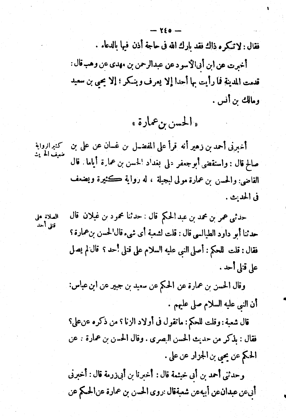 حَدَّثَنِي عُمَر بْن مُحَمَّد بْن عَبْد الحكم قال: حَدَّثَنَا محمود بْن غيلان قَالَ: حَدَّثَنَا أَبُو داود الطيالسي قال: قلت لشعبة: أي شيء قَالَ الْحَسَن بْن عمارة ? فقال: قلت للحكم: أصَلَّى النَّبِيّ صَلَّى اللَّهُ عَلَيْهِ وَسَلَّمَ على قتلي أحد ? قَالَ: لم يصل على قتلي أحد.