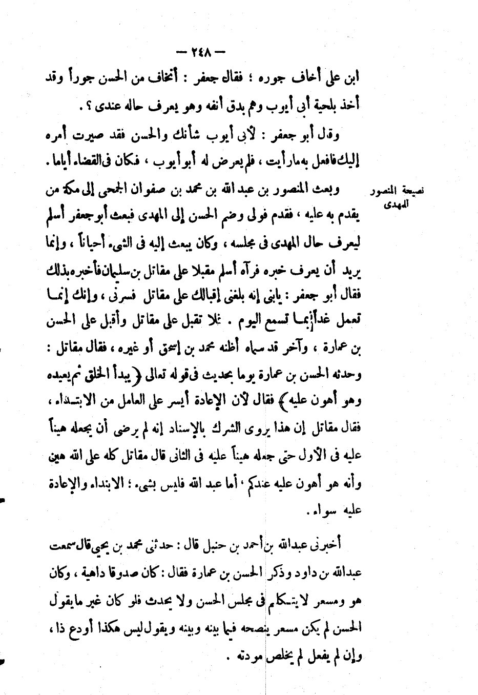 وبعث المنصور بْن عَبْد اللهِ بْن مُحَمَّد بْن صفوان الجمحي إِلَى مكة من يقدم به عليه، فقدم فولي وضم الْحَسَن إِلَى المهدي فبعث أَبُو جعفر أسلم ليعرف حال المهدي في مجلسه، وكان يبعث إليه في الشيء أحياناً، وإنما يريد أن يعرف خبره فرآه أسلم مقبلاً على مقاتل بْن سليمان فأخبره بذلك فَقَالَ أَبُو جعفر: يا بني إنه بلغني إقبالك على مقاتل فسرني، وإنك إنما تعمل غداً بما تسمع اليوم فلا تقبل على مقاتل وأقبل على الْحَسَن بْن عمارة، وآخر قد سماه أظنه مُحَمَّد بْن إسحاق أو غيره، فَقَالَ: مقاتل. وحدثه الْحَسَن بْن عمارة يوماً بحديث في قوله تعالى: {وَهُوَ الَّذِي يَبْدَأُ الْخَلْقَ ثُمَّ يُعِيدُهُ وَهُوَ أَهْوَنُ عَلَيْهِ [الروم:27} فَقَالَ: لأن الإعادة أيسر على العامل من الابتداء، فَقَالَ مقاتل: إن هَذَا يروي الشرك بالإسناد إنه لم يرض أن يجعله هيناً عليه في الأول حتى جعله هيناً عليه في الثاني. قَالَ مقاتل: كله على الله هين وأنه هو أهون عليه عندكم، أما عَبْد اللهِ فليس بشيء؛ الابتداء والإعادة عليه سواء.
