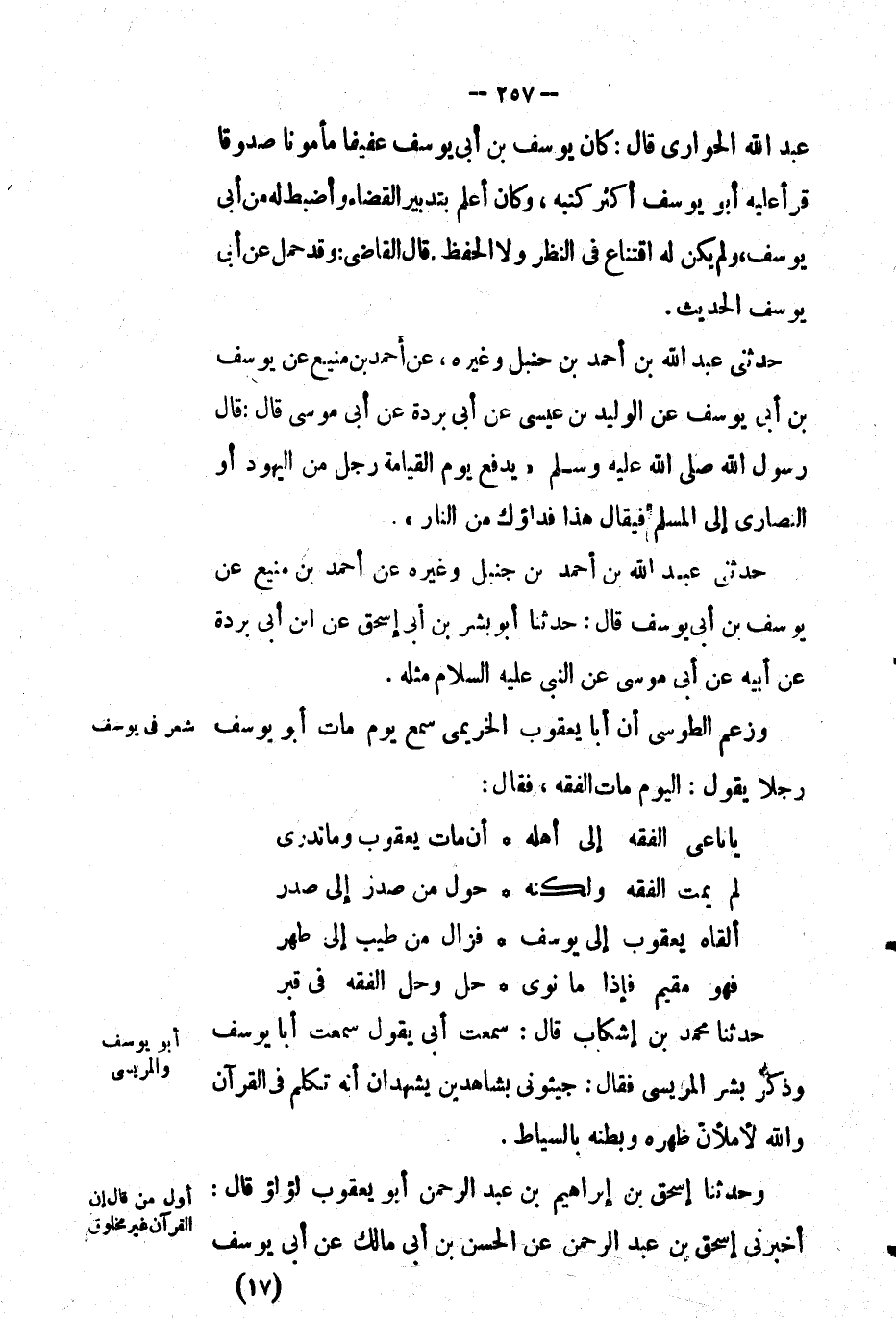 وحَدَّثَنَا إسحاق بْن إبراهيم بْن عَبْد الرحمن أَبُو يعقوب لؤلؤ قال: أَخْبَرَنِي إسحاق بْن عَبْد الرحمن عَن الْحَسَنِ بْن أبي مالك عَن أبي يوسف