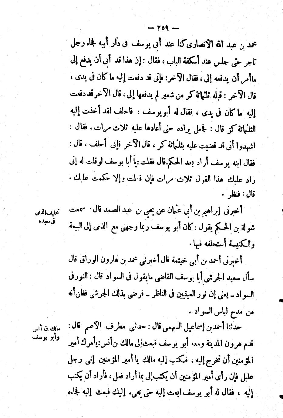 مُحَمَّد بْن عَبْد اللهِ الأنصاري: كنا عند أبي يوسف في دار أبيه فجاء رجل تاجر حتى جلس عند أسكفة الباب، فقال: إن هَذَا قد أبى أن يدفع إلي ما أمر أن يدفعه إلي، فَقَالَ الآخر: فإني قد دفعت إليه ما كان في يدي، قَالَ الآخر: قِبَلَه ثلثمائة كر من شعير لم يدفعها إلي، قَالَ الآخر: قد دفعت إليه ما كان في يدي، فَقَالَ لَهُ أَبُو يوسف: فاحلف لقد أخذت إليه الثلثمائة كر قال: فجعل يراده حتى أعادها عليه ثلاث مرات، فقال: اشهدوا أني قد قضيت عليه بثلثمائة كر، قَالَ الآخر: فإني أحلف، قال: فَقَالَ ابنه يوسف: أراد بعد الحكم. قَالَ: فقلت: يا أبا يوسف لو قلت له: إني راد عليك هَذَا القول ثلاث مرات فإن فعلتَ وإلا حكمتُ عليك. قال: فنظر.
