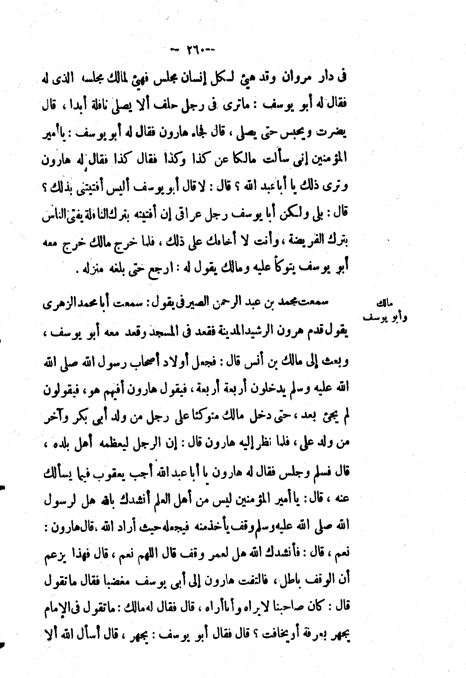 سمعت مُحَمَّدَ بْن عَبْد الرحمن الصيرفي يقول: سمعت أبا مُحَمَّد الزهري يقول: قدم هارون الرشيد المدينة فقعد في المسجد وقعد معه أَبُو يوسف، وبعث إِلَى مالك بْن أنس قال: فجعل أولاد أصحاب رَسُوْلِ اللهِ صَلَّى اللَّهُ عَلَيْهِ وَسَلَّمَ يدخلون أربعة أربعة، فيقول هارون: أفيهم هو؟ فيقولون: لم يجئ بعد، حتى دخل مالك متوكئاً على رجل من ولد أبي بكر وآخر من ولد علي، فلما نظر إليه هارون قال: إن الرجل ليعظمه أهل بلده، قَالَ: فسلم وجلس فَقَالَ لَهُ هارون: يا أبا عَبْد اللهِ أجب يعقوب فيما يسألك عنه، قال: يا أمير المؤمنين ليس من أهل العلم أنشدك بالله هَلْ لرَسُوْلِ اللهِ صَلَّى اللَّهُ عَلَيْهِ وَسَلَّمَ وقف يأخذ منه فيجعله حَيْثُ أراد الله، قَالَ هارون: نعم، قال: فأنشدك الله هَلْ لِعُمَرَ وقف قَالَ: اللهم نعم، قَالَ: فهَذَا يزعم أن الوقف باطل، فالتفت هارون إِلَى أبي يوسف مغضباً فَقَالَ: ما تقول؟ قال: كان صاحبنا لا يراه وأنا أراه، قَالَ: فَقَالَ لَهُ مالك: ما تقول في الإمام يجهر بعرفة أو يخافت ? قَالَ: فَقَالَ أَبُو يوسف: يجهر، قَالَ: أسأل الله ألا
