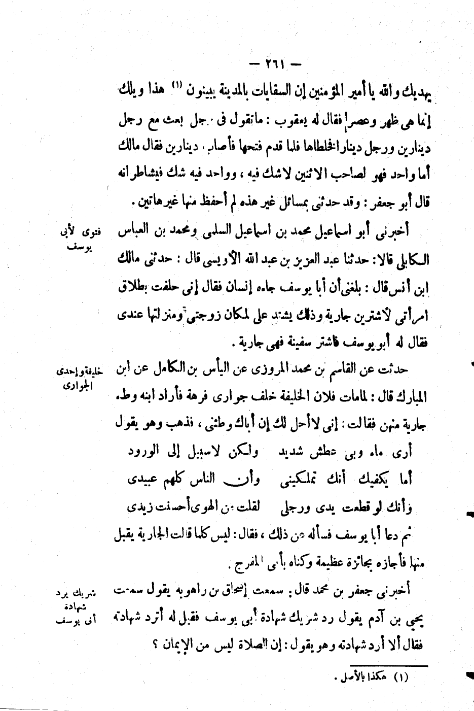 ثم دعا أبا يوسف فسأله عَن ذلك، فقال: ليس كلما قالت الجارية يقبل منها فأجازه بجائزة عظيمة وكناه بأبي المفرج.