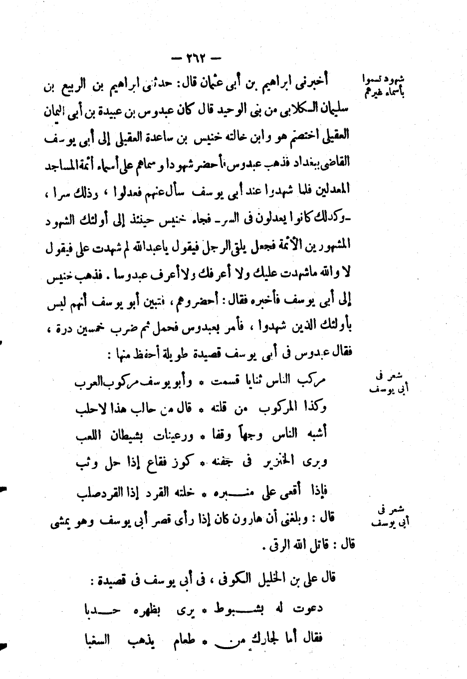 أَخْبَرَنِي إبراهيم بْن أبي عُثْمَان قال: حَدَّثَنِي إبراهيم بْن الربيع بْن سليمان الكلابي من بني الوحيد قَالَ: كان عَبْدوس بْن عبيدة بْن أبي اليمان العقيلي اختصم هو وابن خالته خنيس بْن ساعدة العقيلي إِلَى أبي يوسف القاضي ببغداد فذهب عَبْدوس فأحضر شهوداً وسماهم على أسماء أئمة المساجد المعدلين فلما شهدوا عند أبي يوسف سأل عنهم فعدلوا، وذلك سراً، وكذلك كانوا يعدلون في السر فجاء خنيس حينئذ إِلَى أولئك الشهود المشهورين الأئمة فجعل يلقى الرجل فيقول: يا عَبْد اللهِ لم شهدت علي فيقول: لا والله ما شهدت عليك ولا أعرفك ولا أعرف عَبْدوساً. فذهب خنيس إِلَى أبي يوسف فأخبره فقال: أحضروهم، فتبين أَبُو يوسف أنهم ليس بأولئك الذين شهدوا، فأمر بعَبْدوس فحمل ثم ضرب خمسين درة، فَقَالَ عَبْدوس في أبي يوسف قصيدة طويلة أحفظ منها: