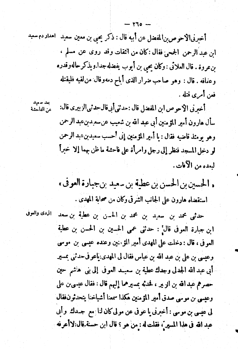 حَدَّثَنِي مُحَمَّد بْن سعيد بْن مُحَمَّد بْن الْحَسَن بْن عطية بْن سعد بن جبارة العوفي قال: حَدَّثَنِي عمي الحسين بْن الْحَسَن بْن عطية العوفي، قال: دخلت على المهدي أمير المؤمنين وعنده عيسى بْن موسى وعيسى بْن علي بْن عَبْد اللهِ بْن عباس فَقَالَ لي المهدي: يا عوفي حَدَّثَنِي بمسير أبي عَبْد اللهِ الجدلي وجدك عطية بْن سعيد العوفي إِلَى بني هاشم حين حصرهم عَبْد اللهِ بْن الزبير، فحدثه بمسيرهما إليهم قال: فَقَالَ عيسى بْن علي وعيسى بْن موسى: صدق أمير المؤمنين هكذا سمعنا أشياخنا يتحدثون. فَقَالَ لي عيسى بْن موسى: أَخْبَرَنِي يا عوفي عَن مولى كان لنا مع جدك وأبي عَبْد اللهِ في هَذَا المسير، فقلت له: من هو ? قَالَ: ابن حسنة. قال: لا أعرفه