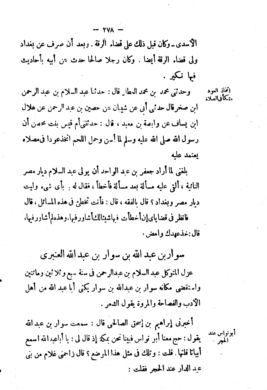 عزل المتوكل عَبْد السلام بْن عَبْد الرحمن في سنة سبع وثلاثين ومائتين واستقضى مكانه سوار بْن عَبْد اللهِ يكنى أبا عَبْد اللهِ من أهل الأدب والفصاحة والمروة يقول الشعر.