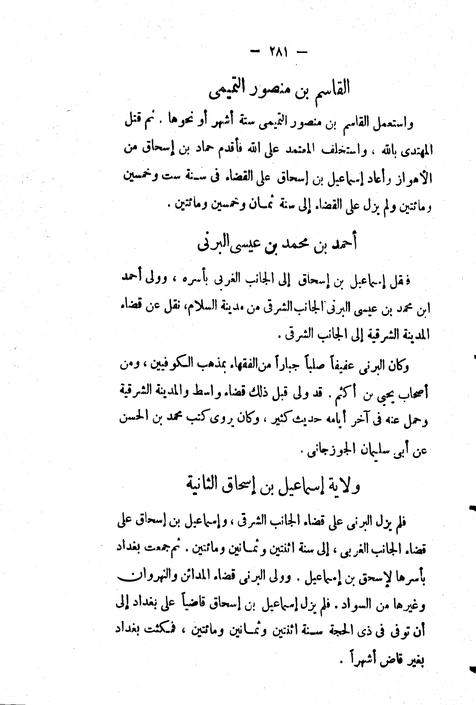 فلم يزل البرني على قضاء الجانب الشرقي، وإسماعيل بْن إسحاق على قضاء الجانب الغربي، إِلَى سنة اثنتين وثمانين ومائتين. ثم جمعت بغداد بأسرها لإسحاق بْن إسماعيل. وولى البرني قضاء المدائن والنهروان وغيرها من السواد. فلم يزل إسماعيل بْن إسحاق قاضياً على بغداد إِلَى أن توفي في ذي الحجة سنة اثنتين وثمانين ومائتين، فمكثت بغداد بغير قاض أشهراً.