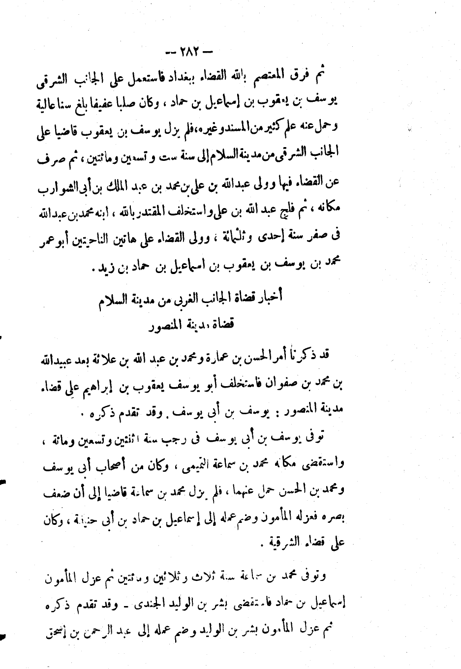 ثم فرق المعتصم بالله القضاء ببغداد فاستعمل على الجانب الشرقي يوسف بْن يعقوب بْن إسماعيل بْن حماد، وكان صلباً عفيفاً بلغ سناً عالية وحمل عنه علم كثير من المسند وغيره، فلم يزل يوسف بْن يعقوب قاضياً على الجانب الشرقي من مدينة السلام إِلَى سنة ست وتسعين ومائتين، ثم صرف عَن القضاء فيها.