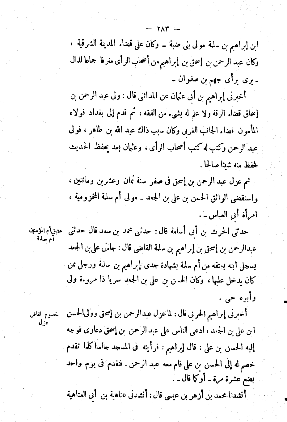 أَخْبَرَنِي إبراهيم الحربي قال: لما عزل عَبْد الرحمن بْن إسحاق وولي الْحَسَن ابن علي بْن الجعد، ادعى الناس على عَبْد الرحمن بْن إسحاق دعاوي فوجه إليه الْحَسَن بْن علي: قَالَ: إبراهيم: فرأيته في المسجد جالساً كما تقدم خصم له إِلَى الْحَسَن بْن علي قام معه عَبْد الرحمن. فتقدم في يوم واحد بضع عشرة مرة أو كما قال.