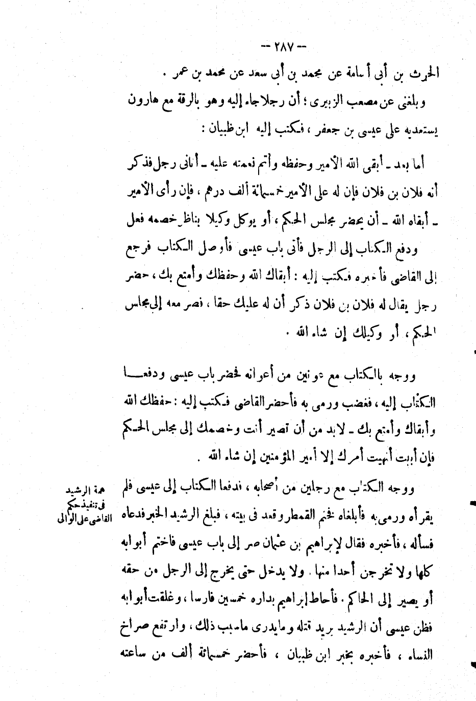 أبقى الله الأمير وحفظه وأتم نعمته عليه أتاني رجل فذكر أنه فلان بْن فلان فإن له على الأمير خمسمائة ألف درهم، فإن رأى الأمير أبقاه الله أن يحضر مجلس الحكم، أو يوكل وكيلاً يناظر خصمه فعل ودفع الكتاب إِلَى الرجل فأتى باب عيسى فأوصل الكتاب فرجع إِلَى القاضي فأخبره فكتب إليه: