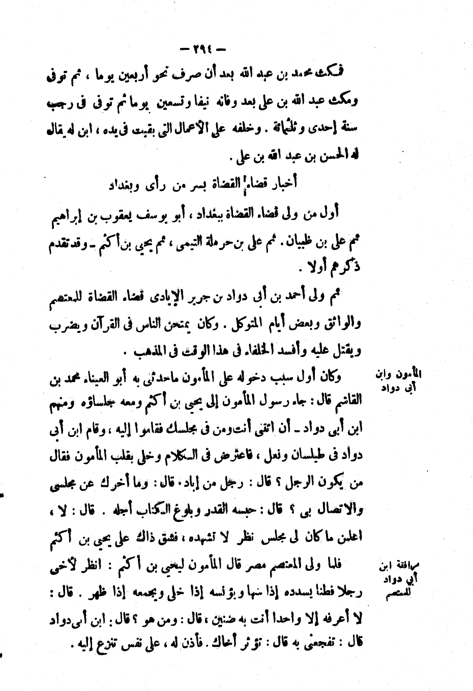ثم ولي أَحْمَد بْن أبي دواد بْن جرير الإيادي قضاء القضاة للمعتصم والواثق وبعض أيام المتوكل. وكان يمتحن الناس في القرآن ويضرب ويقتل عليه وأفسد الخلفاء في هَذَا الوقت في المذهب.