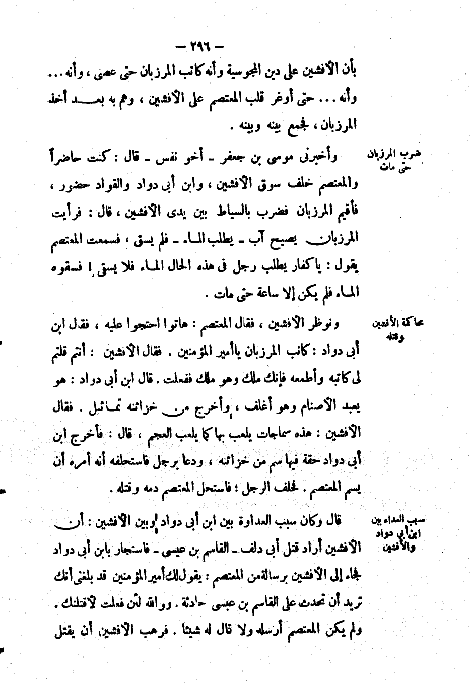 وأَخْبَرَنِي موسى بْن جعفر أخو نفس قال: كنت حاضراً والمعتصم خلف سوق الأفشين، وابن أبي دواد والقواد حضور، فأقيم المرزبان فضرب بالسياط بين يدي الأفشين، قال: فرأيت المرزبان يصيح آب يطلب الماء فلم يسق، فسمعت المعتصم يقول: يا كفار يطلب رجل في هذه الحال الماء فلا يسقى! فسقوه الماء فلم يكن إِلَّا ساعة حتى مات. ونوظر الأفشين، فَقَالَ: المعتصم: هاتوا احتجوا عليه، فَقَالَ: ابن أبي دواد: كاتب المرزبان يا أمير المؤمنين. فَقَالَ: الأفشين: أنتم قلتم لي كاتبه وأطمعه فإنك ملك وهو ملك ففعلت. قَالَ: ابن أبي دواد: هو يعَبْد الأصنام وهو أغلف، وأخرج من خزائنه تماثيل. فَقَالَ: الأفشين: هذه سماجات يلعب بها كما يلعب العجم، قال: فأخرج ابن أبي دواد حقة فيها سم من خزائنه، ودعا برجل فاستحلفه أنه أمره أن يسم المعتصم. فحلف الرجل؛ فاستحل المعتصم دمه وقتله.