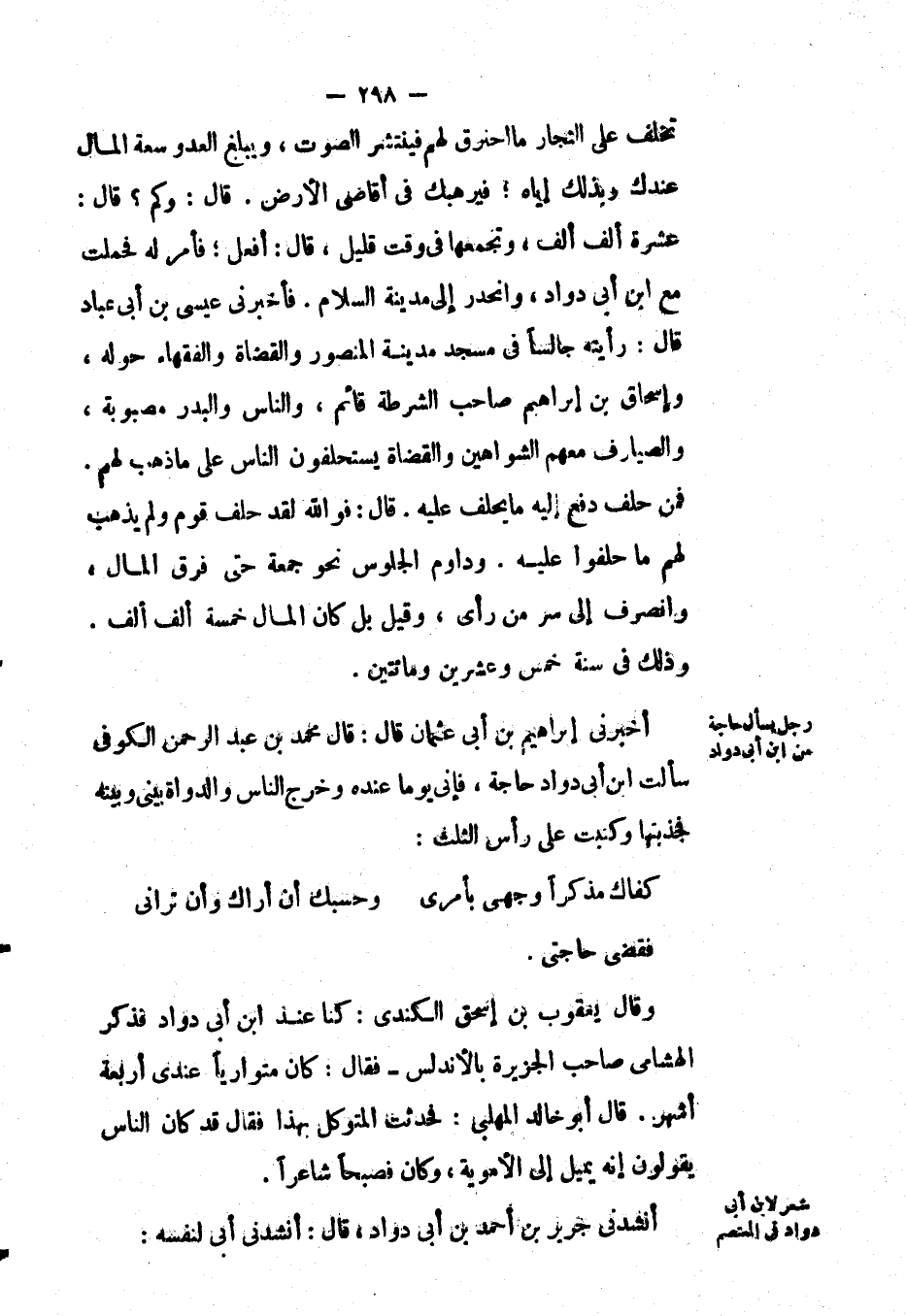 أَخْبَرَنِي إبراهيم بْن أبي عُثْمَان قال: قَالَ: مُحَمَّد بْن عَبْد الرحمن الكوفي سألت ابن أبي دواد حاجة، فإني يوماً عنده وخرج الناس والدواة بيني وبينه فجذبتها وكتبت على رأس الثلث: