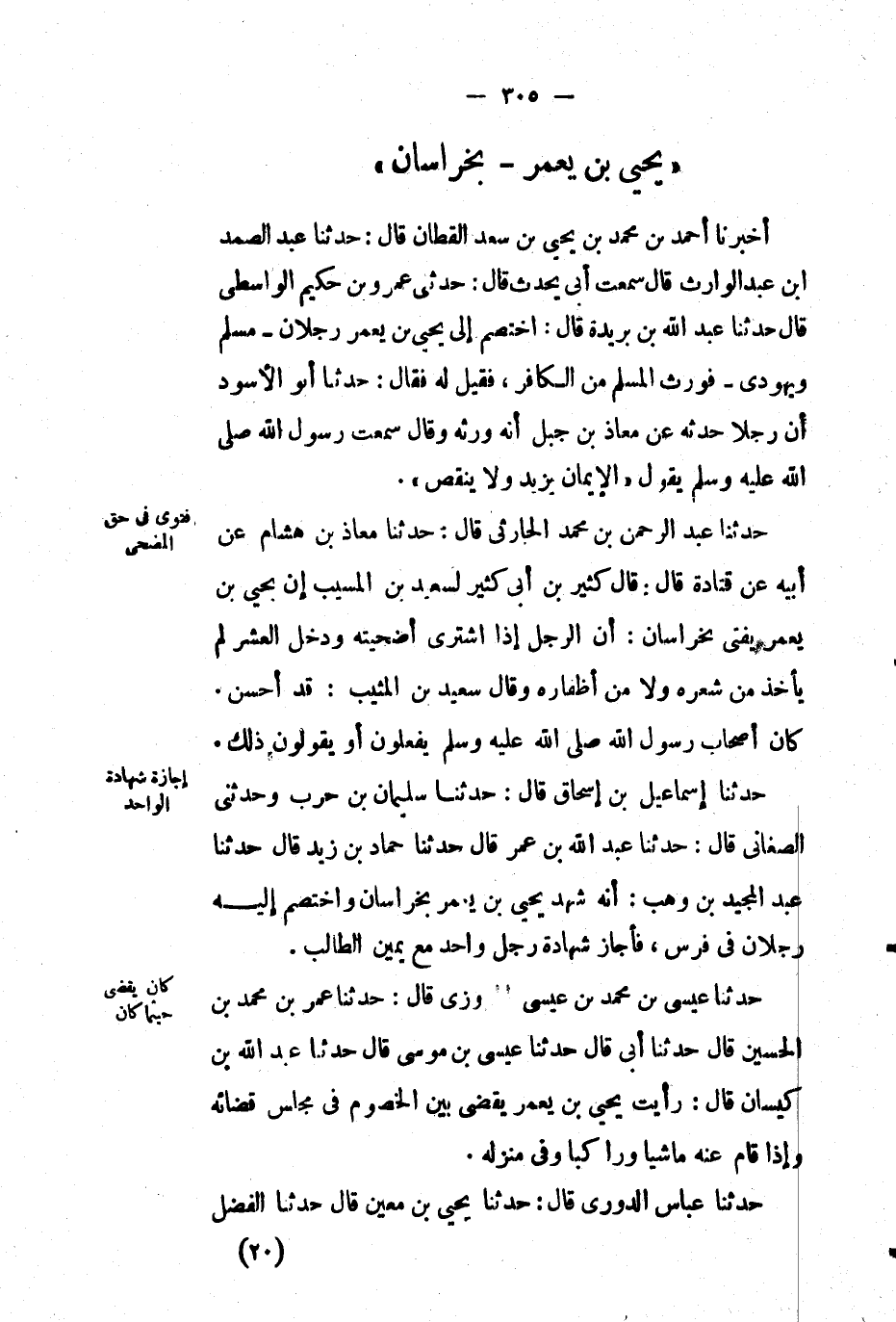 حَدَّثَنَا إسماعيل بْن إسحاق قال: حَدَّثَنَا سليمان بْن حرب وحَدَّثَنِي الصغاني قال: حَدَّثَنَا عَبْدُ اللهِ بْن عُمَر قَالَ: حَدَّثَنَا حماد بْن زيد قَالَ: حَدَّثَنَا عَبْدُ المجيد بْن وهب: أنه شهد يحيى بْن يَعْمُر بخراسان واختصم إليه رجلان في فرس، فأجاز شهادة رجل واحد مع يمين الطالب.
