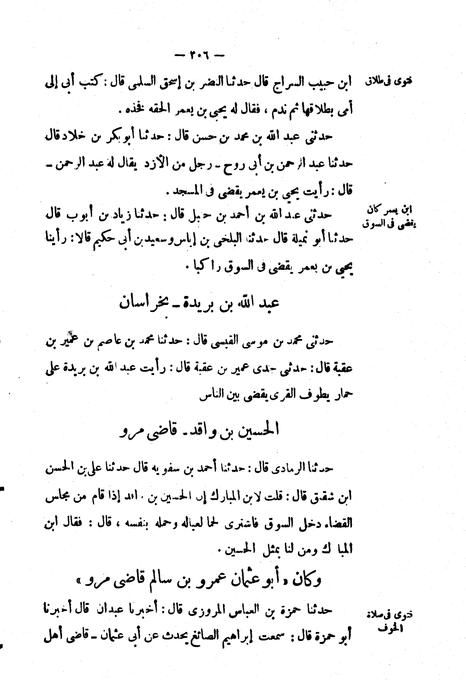 حَدَّثَنِي عَبْدُ اللهِ بْن مُحَمَّد بْن حسن قال: حَدَّثَنَا أَبُو بكر بْن خلاد قَالَ: حَدَّثَنَا عَبْدُ الرحمن بْن أبي روح رجل من الأزد يُقَالُ: له عَبْد الرحمن قال: رأيت يحيى بْن يَعْمُر يقضي في المسجد.