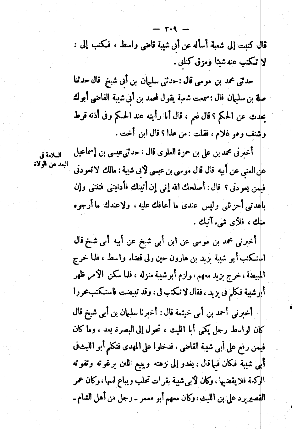 أَخْبَرَنِي مُحَمَّد بْن علي بْن حمزة العلوي قال: حَدَّثَنِي عيسى بْن إسماعيل عَن العتبي عَن أبيه قَالَ: قَالَ موسى بْن عيسى لأبي شيبة: مالك لا تعودني فيمن يعودني ? قال: أصلحك الله إني إن أتيتك فأدنيتني فتنتني وإن باعدتي أحزنتني وليس عندي ما أخافك عليه، ولا عندك ما أرجوه منك، فلأي شيء آتيك.